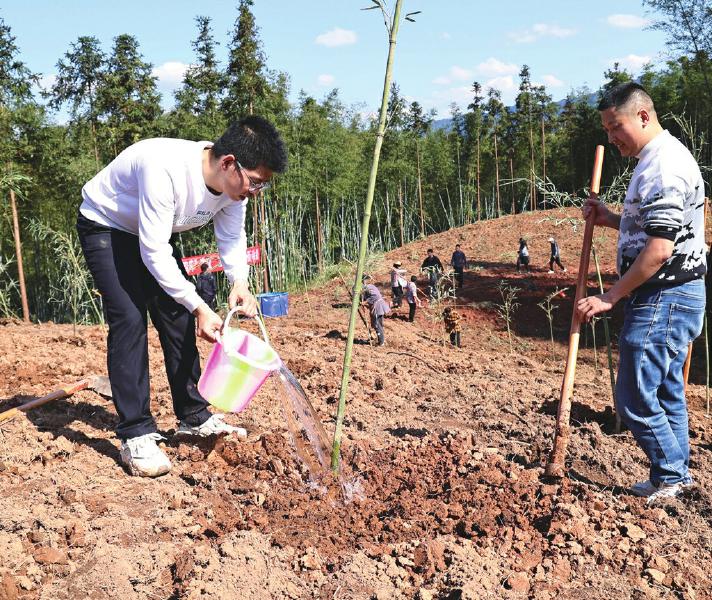 下午3时,植竹活动正式开始。一个多小时后,9 亩林地上新栽的竹苗迎风挺立,与周围的翠竹连成一片,为春日的竹海增添勃勃生机。