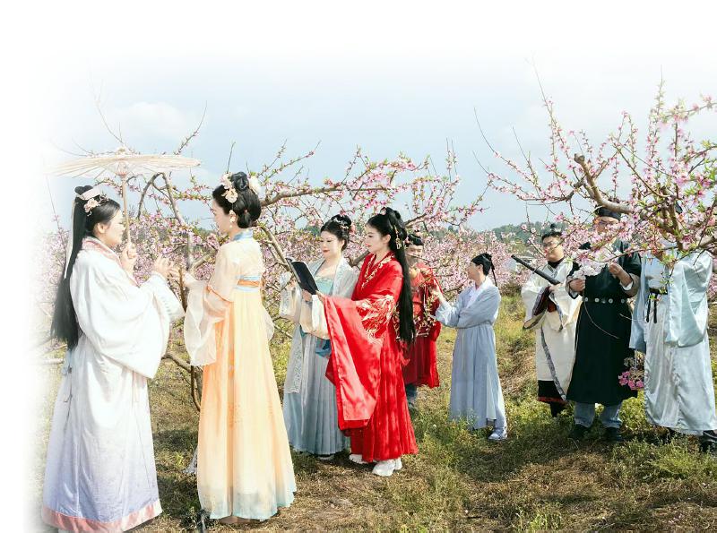 春风细雨中,水文村桃林琴声悠扬,十二位衣袂翩跹的“花神”穿行花间,吸引游客驻足拍摄。以《贺花神》为蓝本打造的十二“花神”打卡活动,成为现场人气亮点。在梅花“花神”点位,游客参与诗词互动,通关后可获得专属印章;桃花“花神”点位前,身着古装的游客排队领取“特权印章”。集章兑奖的形式,有效将人气转化为消费动力。