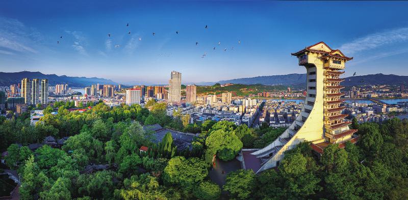 这座楼阁,与广元城市一样非常年轻,其主体为钢筋混凝土结构,外立面采用铝合金茶色玻璃窗,顶部覆盖金黄色琉璃瓦。它既有古代建筑的古朴典雅,又有现代建筑的强健筋骨,在阳光下灵动起舞,散发着时代的气息,被誉为“川北第一楼”。