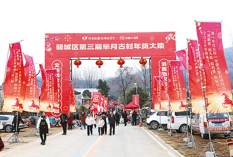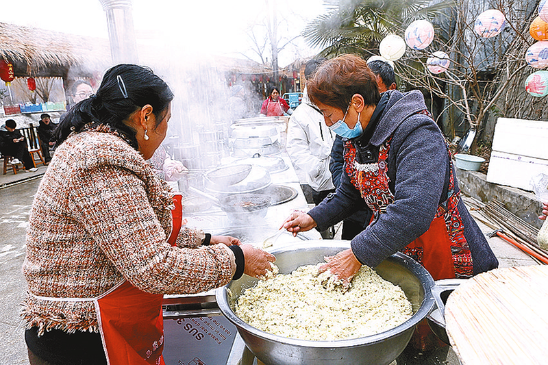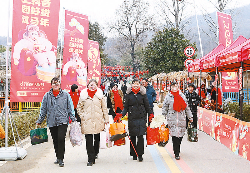 现场制作传统美食,勾起儿时记忆。 芈月古村年货大集热闹非凡。 购买心仪年货,满载而归。