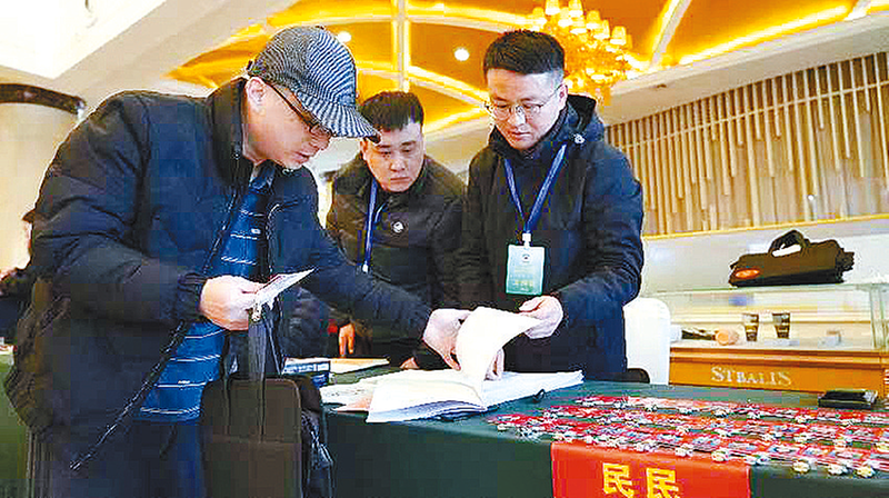 ?工作人员向政协委员发放证件。(全媒体记者 张建/摄)