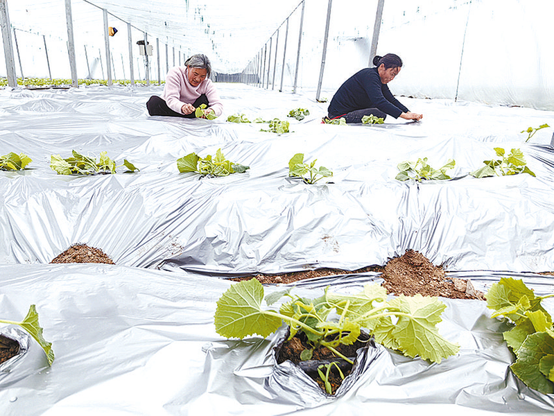 2月25日,在正阳县熊寨镇王楼村蔬菜种植基地,工人正在种植吊瓜。今年该基地种植28棚订单吊瓜,采用“一藤一瓜”模式,确保吊瓜品质。 (全媒体记者 李玉荣)