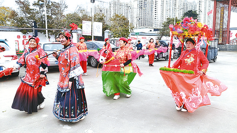 本报讯(文/图 全媒体记者袁敏)日前,驻马店经济开发区关王庙乡关王庙村锣鼓喧天、人头攒动,一场热闹非凡的民俗文艺展演在这里精彩上演。舞狮腾挪跳跃,旱船摇曳生姿,秧歌扭出喜庆,浓浓的年味扑面而来,为当地群众献上了一场精彩纷呈的传统文化“盛宴”(如图)。 当日上午,伴随着铿锵有力的锣鼓声,舞狮表演率先登场。只见雄狮时而腾空跃起、时而摇头摆尾,灵动俏皮的表演引得观众阵阵喝彩。紧接着,划旱船、扭秧歌等民俗节目次第上演。演员们身着鲜艳的盛装,个个精神饱满、神采飞扬,娴熟生动的表演充分展现了民间传统文化的独特魅力。 “今天这场民俗表演特别精彩,让我们实实在在感受到了浓浓的年味!”村民赵保中兴奋地说,“看着这么热闹的场面,心里特别振奋。新的一年,日子更有盼头,生活也更有奔头!” 热闹的表演背后,是民俗表演者们多年如一日的坚守与热爱。关王庙村文化娱乐秧歌队负责人党贵介绍,他们这支民俗表演队成立至今已有28年了。“目前队伍有60多人,都是附近热爱民俗的乡亲。大家平时坚持排练,逢年过节都主动参与演出。不为别的,就是想把老祖宗留下的传统文化传承下去,也为乡亲们带来热闹和喜庆。”