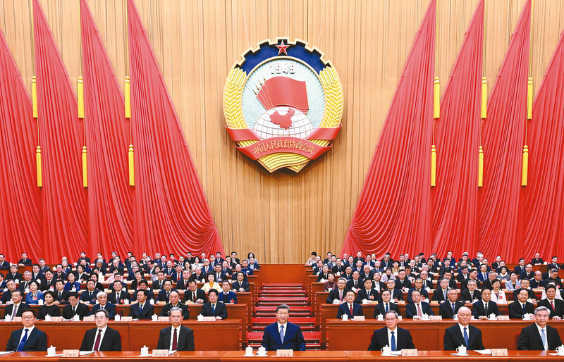 3月4日下午,中国人民政治协商会议第十四届全国委员会第四次会议在北京人民大会堂开幕。这是习近平、李强、赵乐际、蔡奇、丁薛祥、李希、韩正在主席台就座。 (新华社记者 燕雁/摄) 详见2版