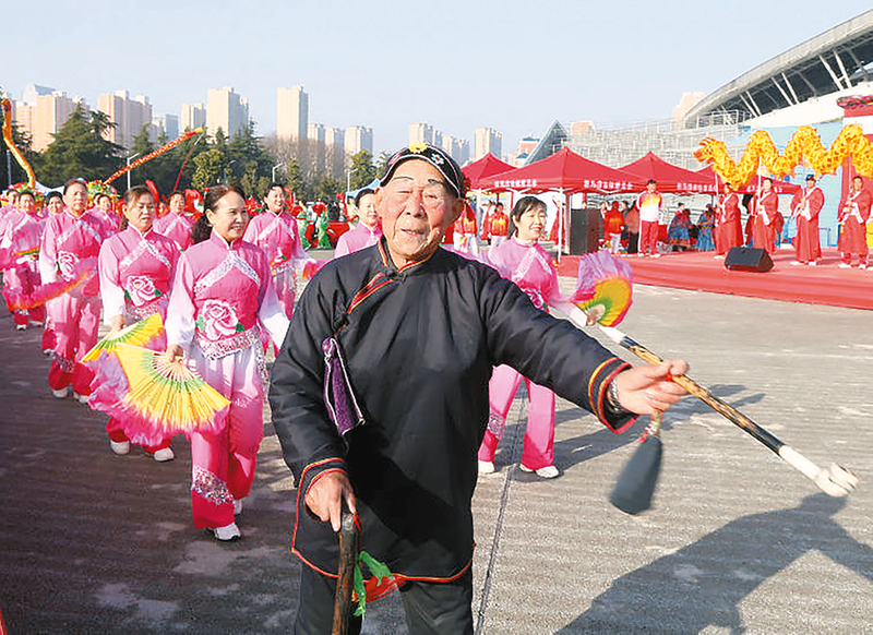 沈德申与他的秧歌队在表演 文/图 全媒体记者 张朝 近日,市区有一场迎元宵节民间艺术演出,一支传统秧歌队刚一登台,就牢牢抓住了全场观众的目光——旱船、小推车依次排开,队伍最前头的“老太太”格外亮眼:扮相逼真,走路一摇三晃,手里拿着一杆长长的旱烟袋,既滑稽又接地气的表演,逗得台下掌声不断,不少人拿起手机拍照录像。 表演结束后记者才知道,这位活灵活现的“老太太”,其实是一位86岁的老汉!他一开口说话,更是令在场的观众纷纷竖起大拇指点赞。 老人名叫沈德申,是驻马店经济开发区关王庙乡杨楼村沈庄人。与民间文艺的缘分,还要从他小时候说起。沈德申的母亲当年是村里的文艺演出积极分子,经常参加秧歌演出,他从小就在一旁观看,耳濡目染,不仅记住了各种表演套路,还能跟着乡亲们一起上台表演。 20世纪80年代,乡亲们的日子越来越好,民间老技艺也越来越受欢迎。沈德申接过母亲的手艺,牵头组建了秧歌演出队。那时候资金紧张,买乐器要跑到郑州,舞狮服、旱船、小毛驴、打花棍这些道具,都是他动手制作的。没想到,做出的道具色彩鲜亮、造型逼真,一点不比买来的差。 这支队伍慢慢发展到70多人,大家心齐劲足,表演十分精彩。每年元宵佳节,他们的节目总能在遂平县的演出中拿到一、二、三等奖。名气越来越大,沈德申和演出队受邀到工厂、企业等单位演出的次数越来越多,所到之处都深受欢迎。 沈德申介绍,秧歌队节目很丰富,小推车、抬花轿、踩高跷、打花棍等。他常说,自己是村里的文艺骨干,这些老传统可不能丢。为了把节目演得更出彩,他没少下功夫:平时爱看各类民间演出,有了电视以后,就对着节目仔细观看、认真学习、反复揣摩模仿,慢慢练出自己的技巧,再传授给乡亲们。舞台上那些挠痒痒、擤鼻涕、抽旱烟、走路扭捏的经典动作,都是他从日常生活中细心观察来的。 文艺来源于生活,民间的东西最有生命力。正是因为他们的表演接地气,很受欢迎,每次参加市里的民间大会演,现场都人山人海,观众把舞台围得水泄不通。 沈德申坚信“曲不离口,拳不离手”。平时,他没事就到市区人民公园扭上几圈。 一辈子痴迷文艺,也让沈德申身体硬朗、精神十足。如今86岁的他性格开朗,记忆力特别好,手机号码能脱口而出、一字不差。平日里,他还爱看书、写字、画画,时常教导孙辈:“读万卷书,行万里路”“忘了吃饭也别忘了学习”。 让老人最欣慰的是,家里的孙子们已经有人跟着他学起了这些老手艺,传统民间文艺,正在一辈辈传承下去。