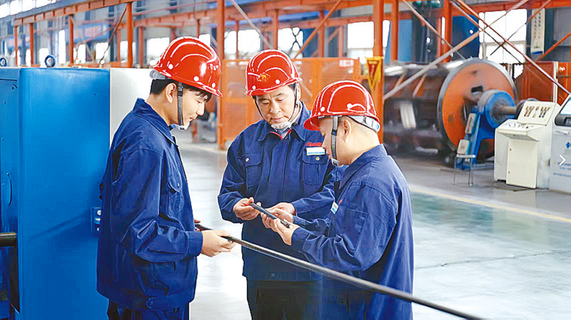 河南乐山电缆有限公司董事长李全岭(中)与技术人员一同检查电缆产品质量