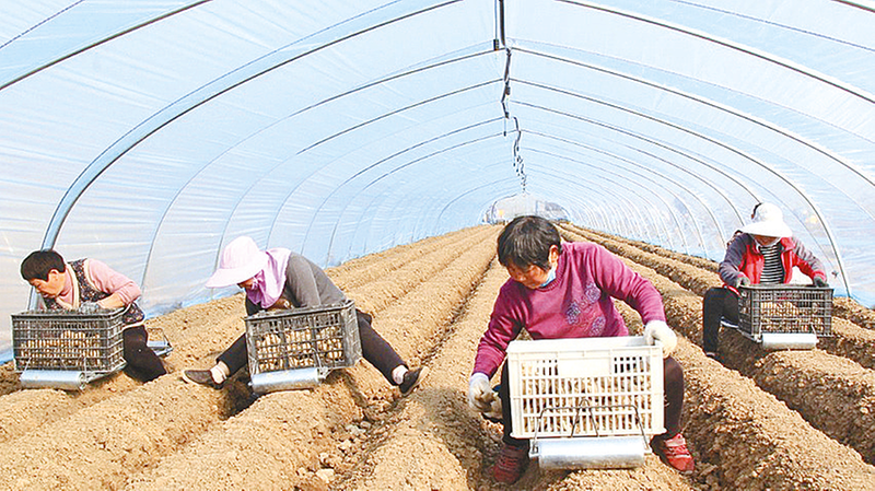 本报讯(全媒体记者 熊国森 见习记者 梅文辉)春雨润田春耕忙,生姜种植正当时。眼下正是种姜的黄金季节,在新蔡县陈店镇永丰农业种植合作社生姜种植基地,一座座塑料大棚整齐排列,在春日阳光下格外耀眼。大棚内,春意盎然,热闹非凡,村民正在抢抓农时,挖沟、打垄、喷洒营养液、放置姜母、覆土,各条工序有条不紊(如图),一幅生机勃勃的“春耕图”在广袤田野上徐徐展开。 “这是我第二年种植生姜,种植了50多亩。每亩投入约1万元,产量按正常年份每亩可达1.5万斤,按当前市场批发价每斤2.8元至4元计算,亩均增收两三万元不成问题。合作社采取“订单式”销售模式,目前已与郑州市万邦农贸市场、山东宏博农贸市场建立稳定合作关系,生姜从地头直通消费者餐桌,销路不愁、价格还有保障。”谈起今年的愿景,合作社负责人管磊信心满满地说。 今年39岁的管磊是当地小有名气的“生姜大王”,初中毕业后便外出打工,走南闯北打拼十几年,在钱包鼓起来的同时,也积累了丰富的经验。两年前,在国家乡村振兴富民政策的指引下,他毅然返乡创业,在陈店镇流转1700余亩土地,开启了全新的农业种植之路。凭着敢想敢干敢拼的劲头,他摸索出“小麦+生姜”循环种植模式,有效解决了生姜不能重茬的难题,并因地制宜走出一条集种植、培育、储存、销售为一体的生姜种植产业链。 “我们合作社固定用工10人,农忙的时候,每天用工量超过40人。他们大都是附近的村民,每人每天能挣80元到100元不等。”管磊说。63岁的谢金星是谢围子村的一名技术工,干起活来一点儿不输年轻人。“我年龄大了,外出打工没人要了,家里种了几亩地,农闲时来这儿干活,挣点儿零花钱,给孩子们减轻点儿负担。”谢金星脸上露出灿烂的笑容。 生姜是陈店镇传统特色农产品,以肉质脆嫩、香辣适中、品质上佳等特点深受市场欢迎。目前,生姜种植在该镇已形成规模化发展态势,生姜产业也已成为全镇辐射带动农户增收的特色富民产业。如今,在陈店镇,小小的生姜正成为村民增收致富的“金疙瘩”,为乡村振兴注入源源不断的活力。