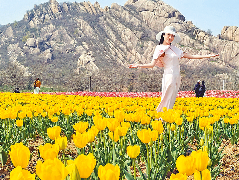 本报讯(文/图 全媒体记者 王晓晶 陈宁)3月22日,位于嵖岈山风景区脚下的嵖岈山郁金香主题花海正式开园,近400万株郁金香竞相绽放,如斑斓锦缎铺展大地,开园首日便吸引大批游客纷至沓来。 500余亩园区内,苹果软糖、中国女孩、凌源等100余个名贵品种的郁金香红似火、粉如霞、黄若金、白胜雪。游客们在花海中打卡拍照,共赴这场春日限定的视觉“盛宴”(如图)。 花海之中,汉服走秀衣袂飘飘,佳人与郁金香共绘一幅流动的古典画卷;民俗抬花轿表演锣鼓声起、唢呐悠扬,将乡土风情融入烂漫春色;花间音乐会弦歌袅袅,琴声与风吟交织,为游人带来视听交织的沉浸体验。传统与潮流在此交汇,赏花之余更添意趣,引得众多游客驻足欣赏、连连喝彩。 为丰富景观层次,园区还巧妙搭配种植樱花、海棠、油菜花,与郁金香相映成趣,勾勒出层次分明、诗意盎然的春日画卷。微风吹过,花浪翻涌,暗香浮动,移步换景间,游人仿若置身唯美童话秘境,沉醉不知归路。