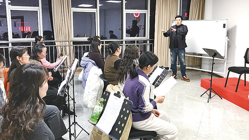 音乐教师细致讲解歌曲演唱技巧。 文/图 全媒体记者 张朝 3月19日,华灯初上,春风轻拂,市总工会职工夜校准时启幕。结束白日忙碌的职工学员结伴而来、有序入座,在静谧的夜晚,赴一场文化与技艺的邀约。 晚上6时30分,随着各类课程相继开课,夜校的灯火成为城市夜色中最具温度的文化印记。 绘画教室内,老师轻声讲解梅花画法:“画梅讲究以瘦为美、以奇为贵,枝要劲、花要疏,重风骨、忌繁乱。”学员们围站在黑板前,凝神观摩老师运笔手法,有人悄悄举起手机记录细节,生怕错过每一个技法要点,静谧的教室里,唯有笔墨轻划的声响。 另一侧的音乐教室里,国家二级演员王志鹏老师以专业视角,拆解歌曲《敕勒川》的唱法精髓,时而示范演唱,时而纠正发音,引领学员们感受旋律中的草原意境。学员们认真聆听、放声合唱,一曲终了,满室余韵。“近距离聆听专业老师授课,不仅学会了唱歌技巧,更感受到了音乐的魅力,收获满满。”一位学员由衷感慨。 为丰富职工业余文化生活,营造文明高雅的社会文化氛围,市总工会持续深耕职工夜校文化服务项目,打造出内容丰富、师资专业的文化阵地。2026年,职工夜校精心开设4大类31门课程,涵盖文化、艺术、器乐、健身四大领域——文化类有书法、国画、篆刻等,艺术类包含戏曲、声乐、古典舞等,器乐类涵盖古筝、古琴、吉他等,健身类则有瑜伽、太极拳、养生扇等,全方位满足职工多样化的学习需求。 书法课堂上,老师系统梳理中国书法史脉络,引导学员明确临摹方向、掌握书写技法,通过集中面授与针对性训练,助力学员从临摹走向创作。绘画课堂上,以梅、兰、竹、菊为切入点,讲解毛笔线条运用、墨色变化与色彩搭配,结合临摹与写生,培养学员的观察造型能力与艺术表现力,让职工在笔墨丹青中感受传统美学的魅力。 绘画班学员尹君坦言:“这是我上的第二堂课,晚上来这里学习,既能掌握绘画技艺、感受传统文化,又能放松心情、排解工作压力,每一堂课都过得充实又愉悦。” 夜幕渐深,街头的喧闹渐渐褪去,职工夜校的大楼依旧灯火通明。一束束灯光,照亮的不仅是职工们求知的身影,更点亮了城市的文化底色,让文化薪火在夜晚传递,温润着每一位职工的生活。