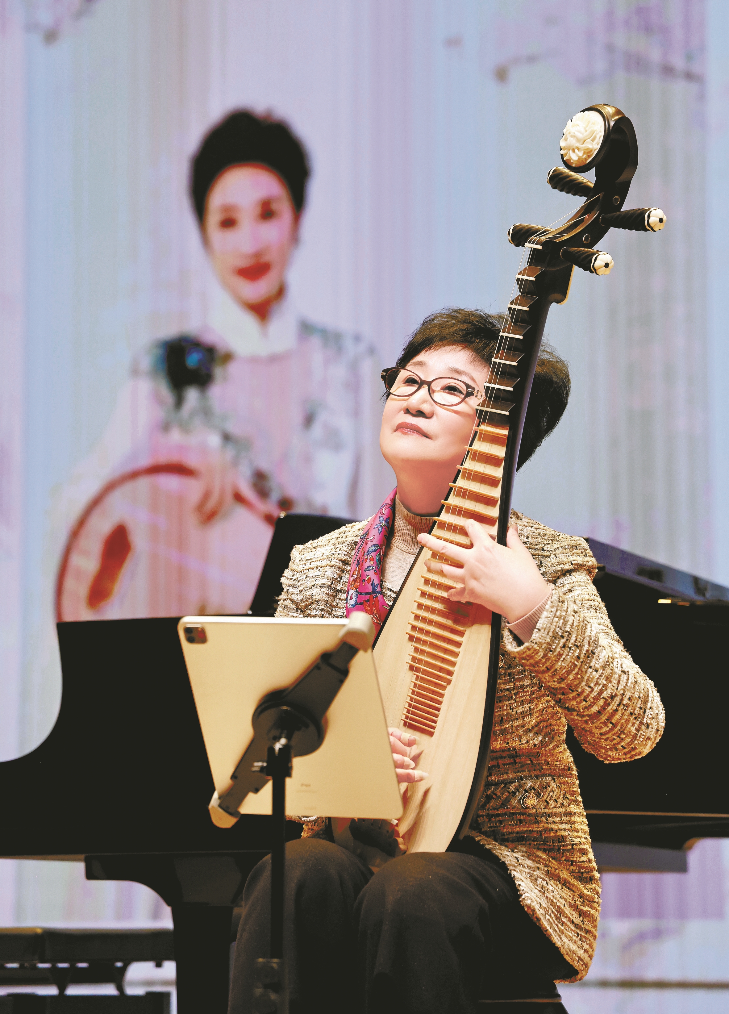 在钢琴、琵琶合奏《云想花想》中,吴玉霞引用诗词“云想衣裳花想容,春风拂槛露华浓”代入想象,婀娜多姿的女子风韵,仿佛让人置身于繁花似锦的春日盛景之中。