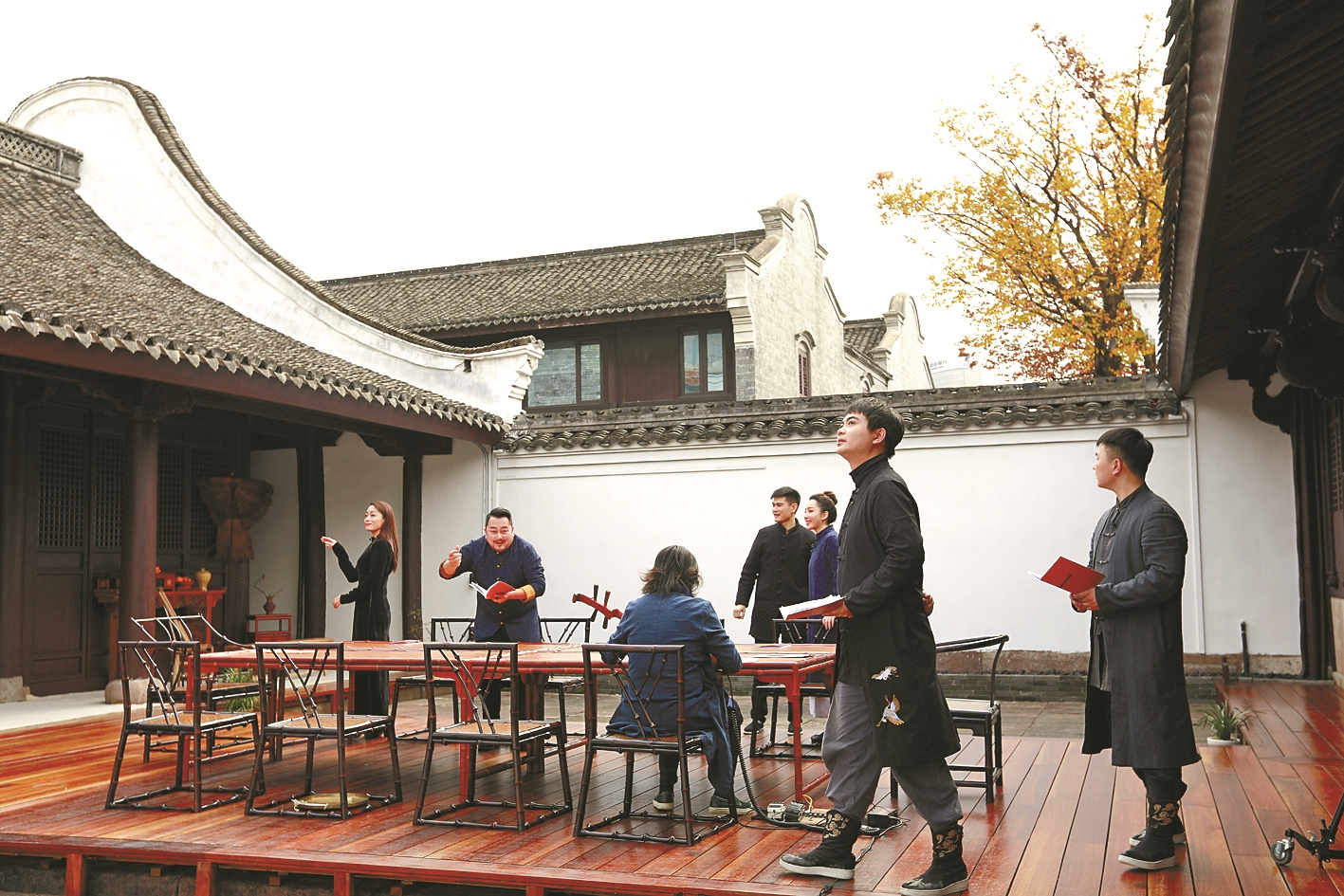 2021年,《听·见 鄞令王安石》更是打破常规,采用庭院实景浸入式戏剧录制,进行线上展播。罗洁利用演出场地宁波戏剧书房的四方院落,打造了一个多维度的戏剧秀作品。“从‘剧本围读’入戏,结合剧本的情节主线,让演员自然地游离在镜头下。”海曙区作家协会影视创委会主任、《听·见》系列统筹薛云评价,整出戏的调度既像读剧、排练般自由松弛,又具备正剧的严谨和顺畅。