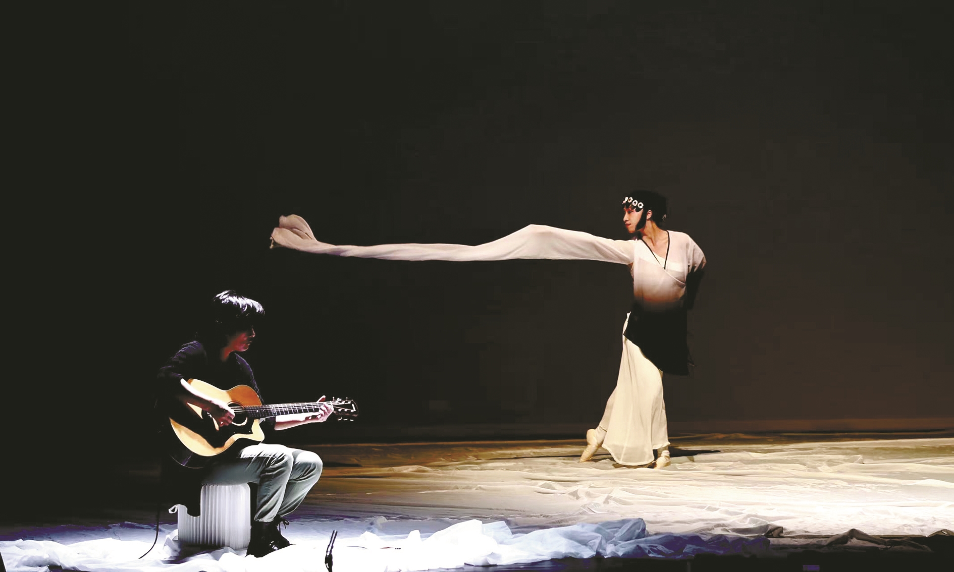 演出前,为了舞台效果和节约经费,团队扛着一块十几公斤重的白布飞往爱丁堡。舞台上,这块白布变化成水纹、群山、桌台、画轴,空处显像,实处生韵,尽显中国文化的丰富与含蓄。大鼓不方便携带,王晓菁联系了英国当地的留学生,他们在伦敦借到大鼓,坐了几个小时的火车带到爱丁堡。