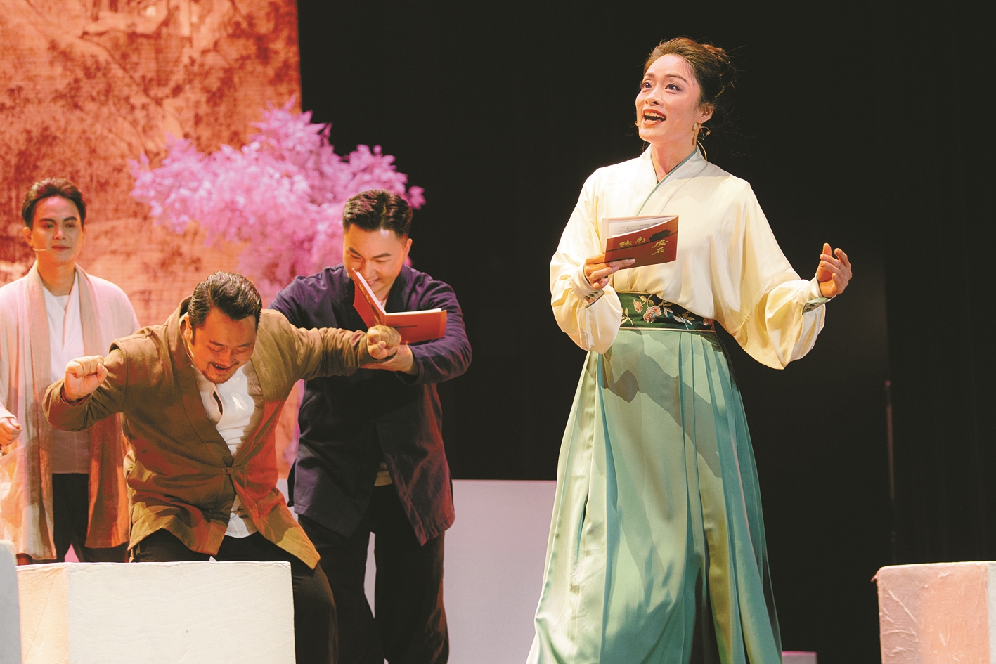 朗读极富感情,朗读者们时而站,时而坐,时而踱步,时而沉思……段落间隙,低沉、宽厚的大提琴声响起,把观众带到剧中人张苍水身处的时代。临近结束,一名身穿古装的美丽女子缓缓从化妆台前起身,抬头、举手,每一个动作都充满了韵味,这一柔美的戏曲身段也给整个朗读会增色不少。