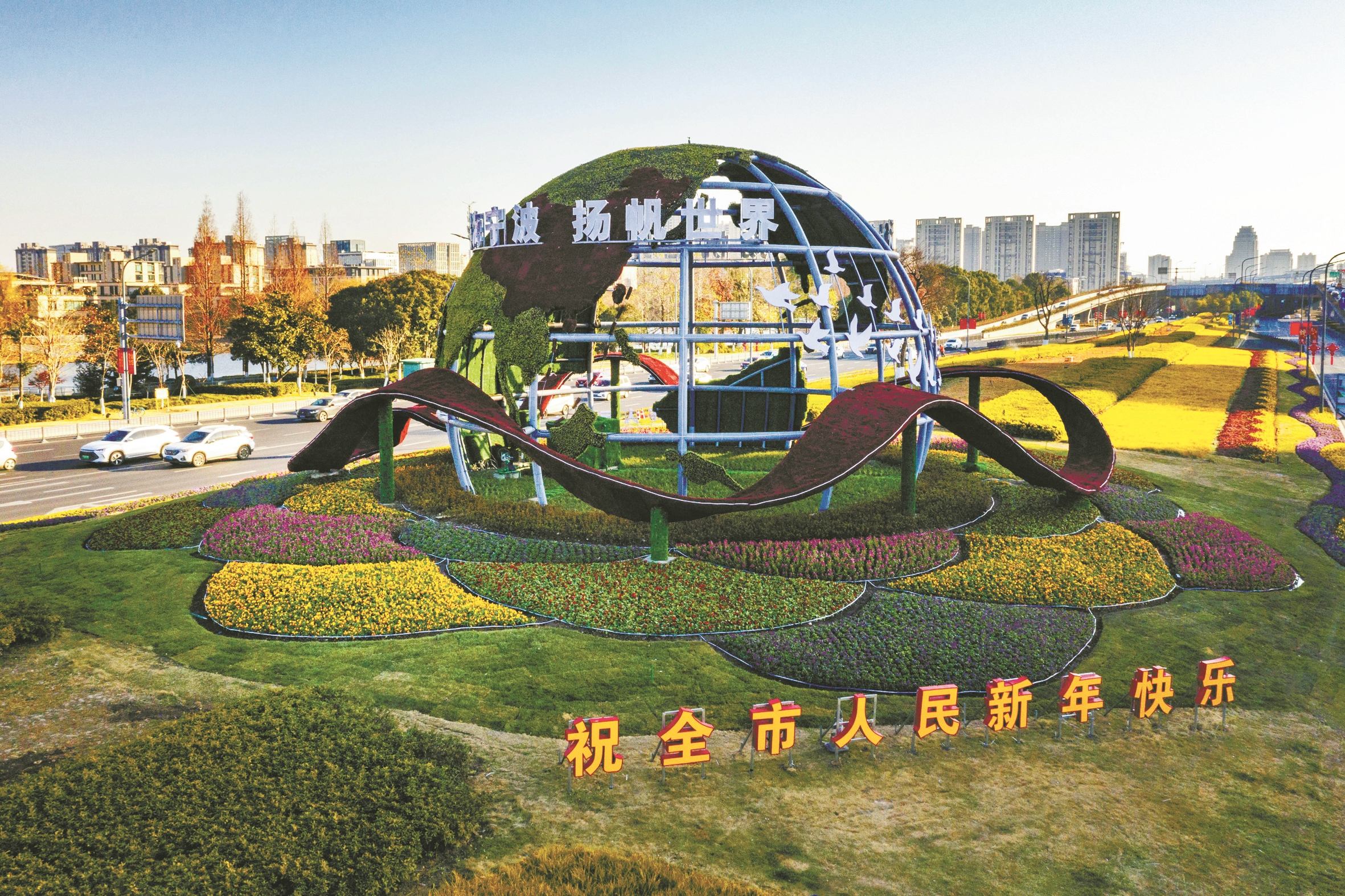 晨光中,绛色“飘带”环绕硕大的“地球仪”,色彩斑斓的绿化带好似“彩虹地毯”;广场上,跃动的锦鲤、憨态可掬的“蛇宝”笑迎游客……最近,我市园林绿化部门制作完成的各色绿雕扮靓街头,喜迎蛇年春节的气氛日渐浓郁。图为位于世纪大道的“地球仪”绿雕。