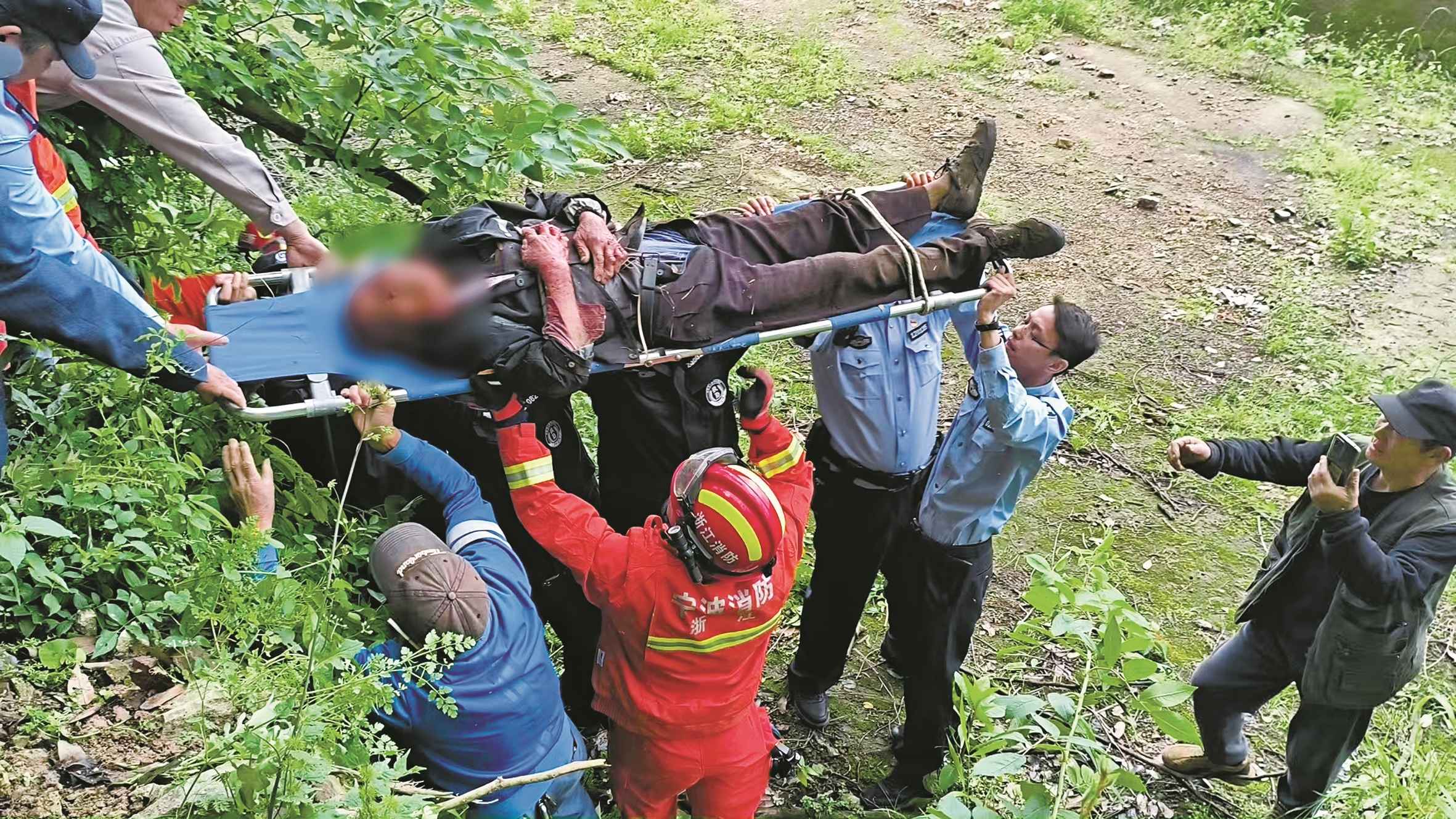 海曙章水派出所日前接到一则紧急求助:一名男子在章水镇大皎村附近的竹山上不慎摔倒,腿部疑似骨折,无法动弹导致被困。