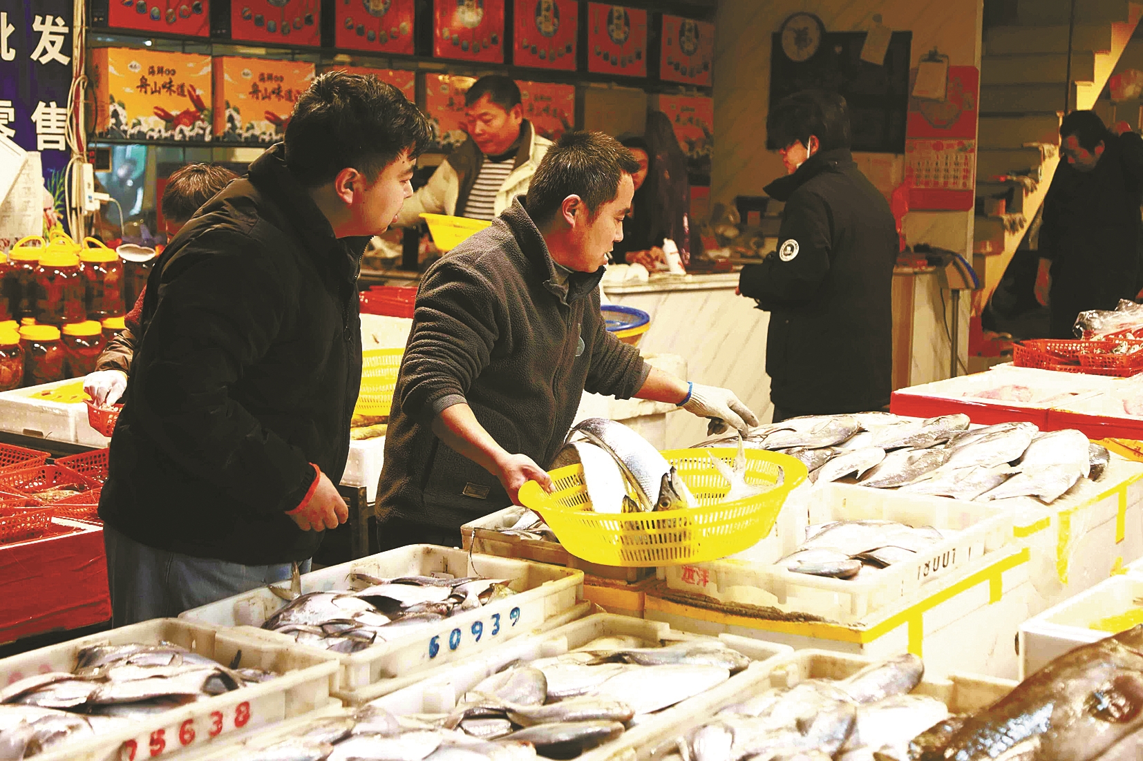 市民黎敬元把精心挑选的海鲜放入篮筐中准备结算,他开心地说:“宁波人的年夜饭上一定要有大黄鱼、泥螺等海鲜。这里的老板还可以根据顾客需求帮忙搭配海鲜大礼包,服务不错。”市民晏先生计划采购56个海鲜礼盒,他说:“批发市场里的海鲜品种丰富,一直是我们采购的首选地。”