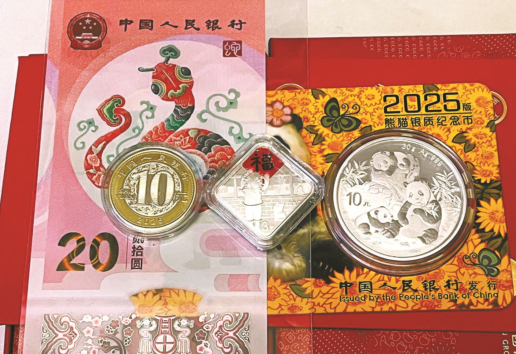 一枚2025年版银质熊猫纪念币、一枚蛇年纪念币、一张蛇年纪念钞,以及一枚面市不久的乙巳年福字银币……昨日一大早,市民张女士将自己近段时间购买的纪念币、纪念钞放入压岁包,打算在除夕夜送给儿子,让他在新年讨个好彩头。