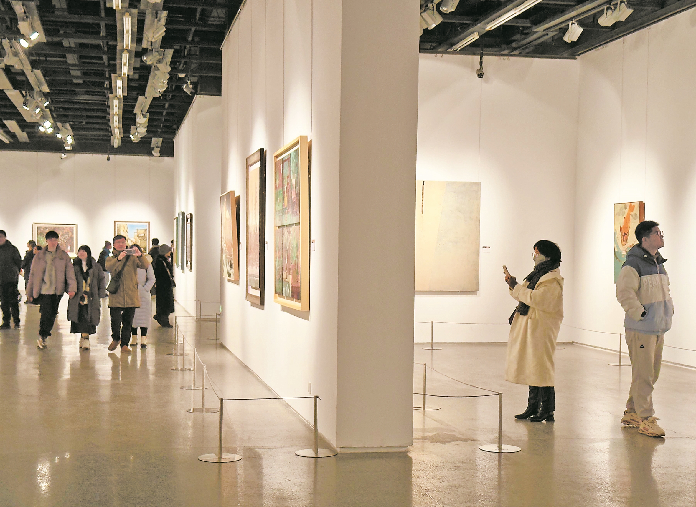 昨日,春节假期里的宁波美术馆被浓厚的艺术氛围萦绕,成为市民休闲放松的热门之选。馆内,“金蛇舞——陈汉的生肖时代展”“第四届中国(宁波北仑)青年漆画展览”“光影悦动——宁波美术馆藏经典油画陈列”等同时展出。据介绍,自春节假期开始,馆内每日参观人数均接近场馆最大承载量。(徐诚 徐良 摄)