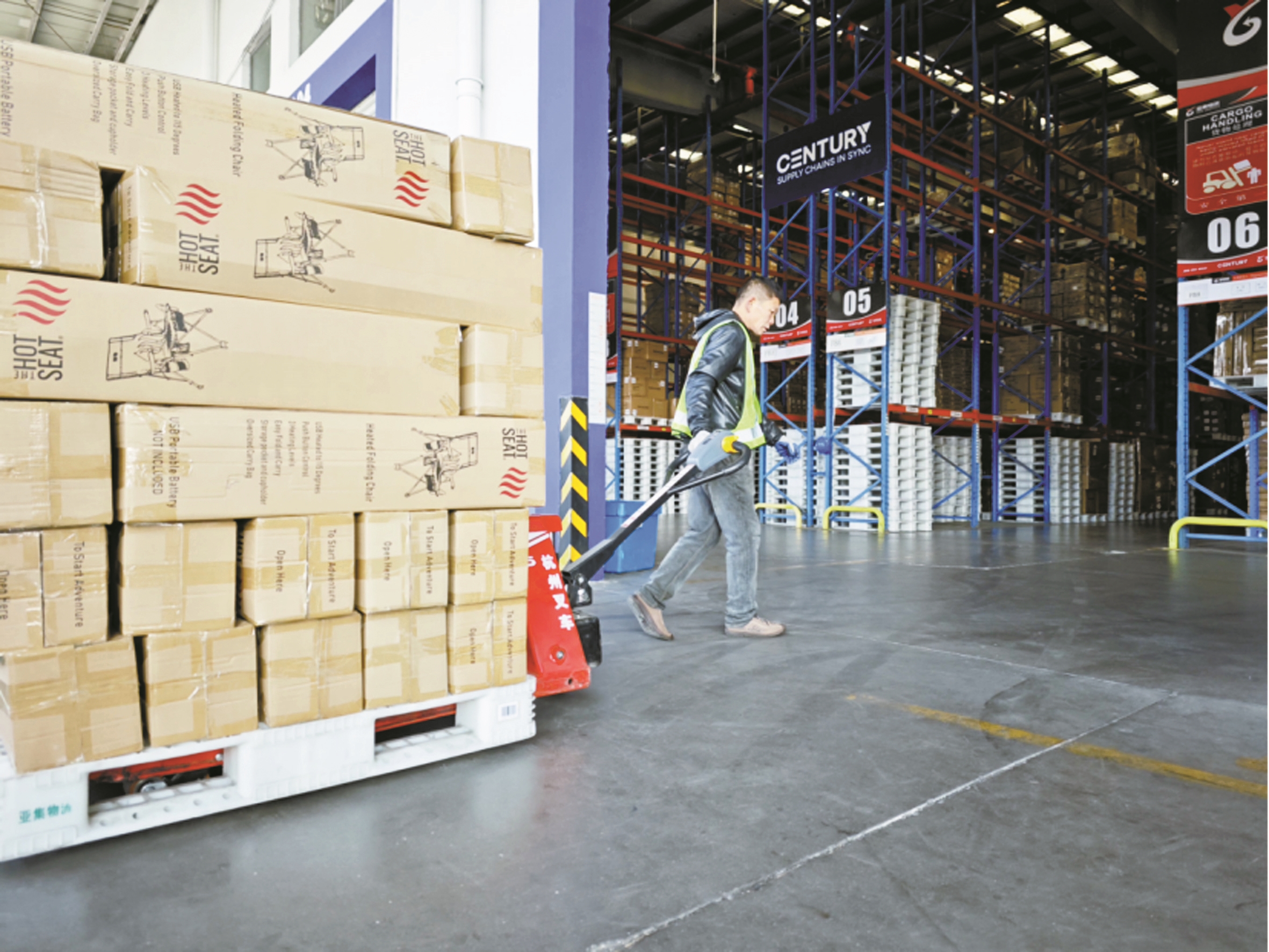 工作人员正在宁波亚集物流有限公司梅山保税仓库装卸货物。(孙佳骏 摄)