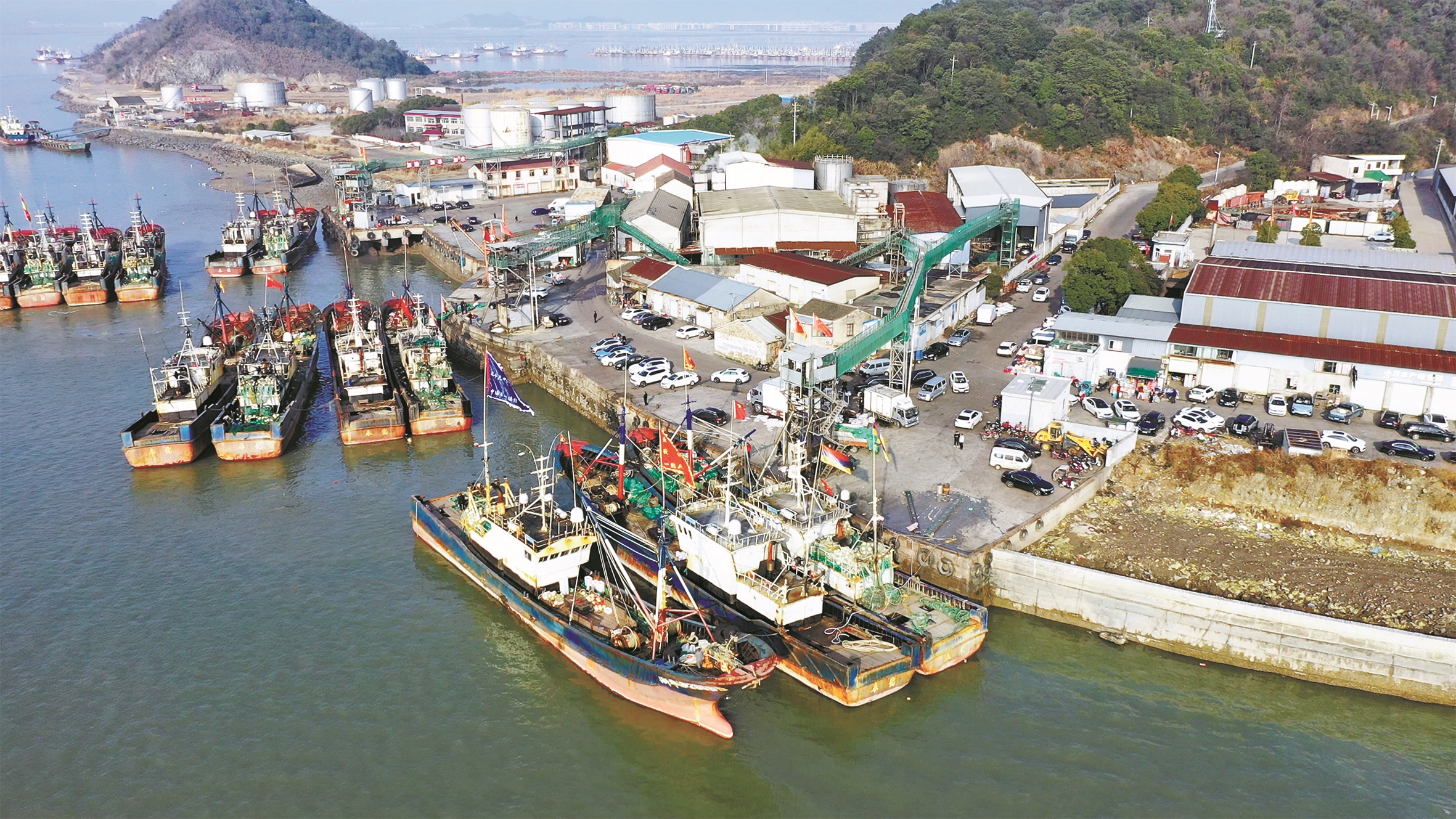 昨日一早,奉化区莼湖街道的渔港码头呈现一派热火朝天的景象。一艘艘渔船整齐列阵,桅杆上的红旗随风飘扬,渔民在船上穿梭忙碌,加油、加冰,装载渔具,搬运生活物资,准备出海捕鱼。