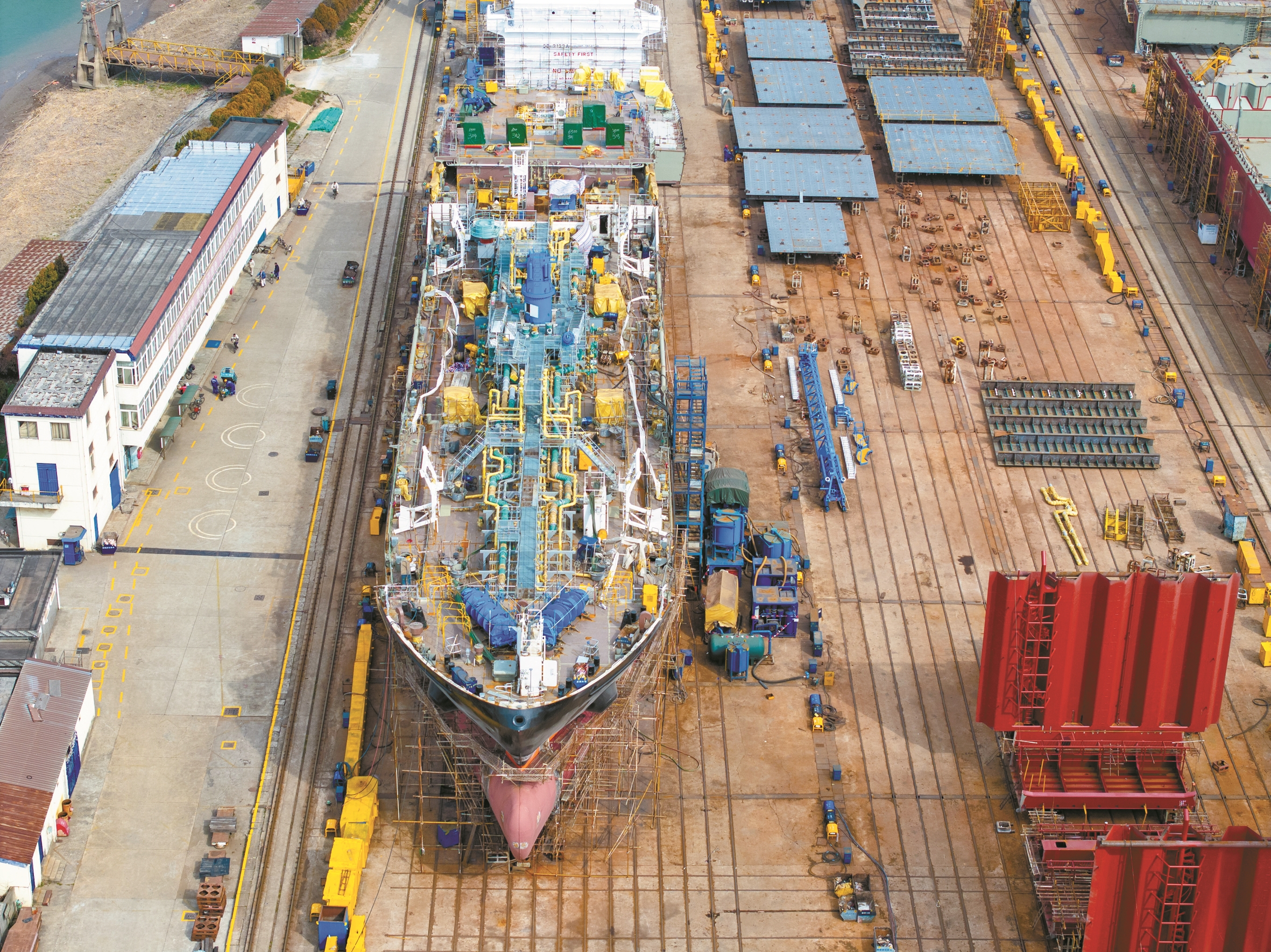2月5日,工人在位于江苏南京的招商工业南京金陵船厂赶制船舶订单(无人机照片)。当日是春节假期后首个工作日,各地企业铆足干劲忙生产,力争首季“开门红”。(新华社发)