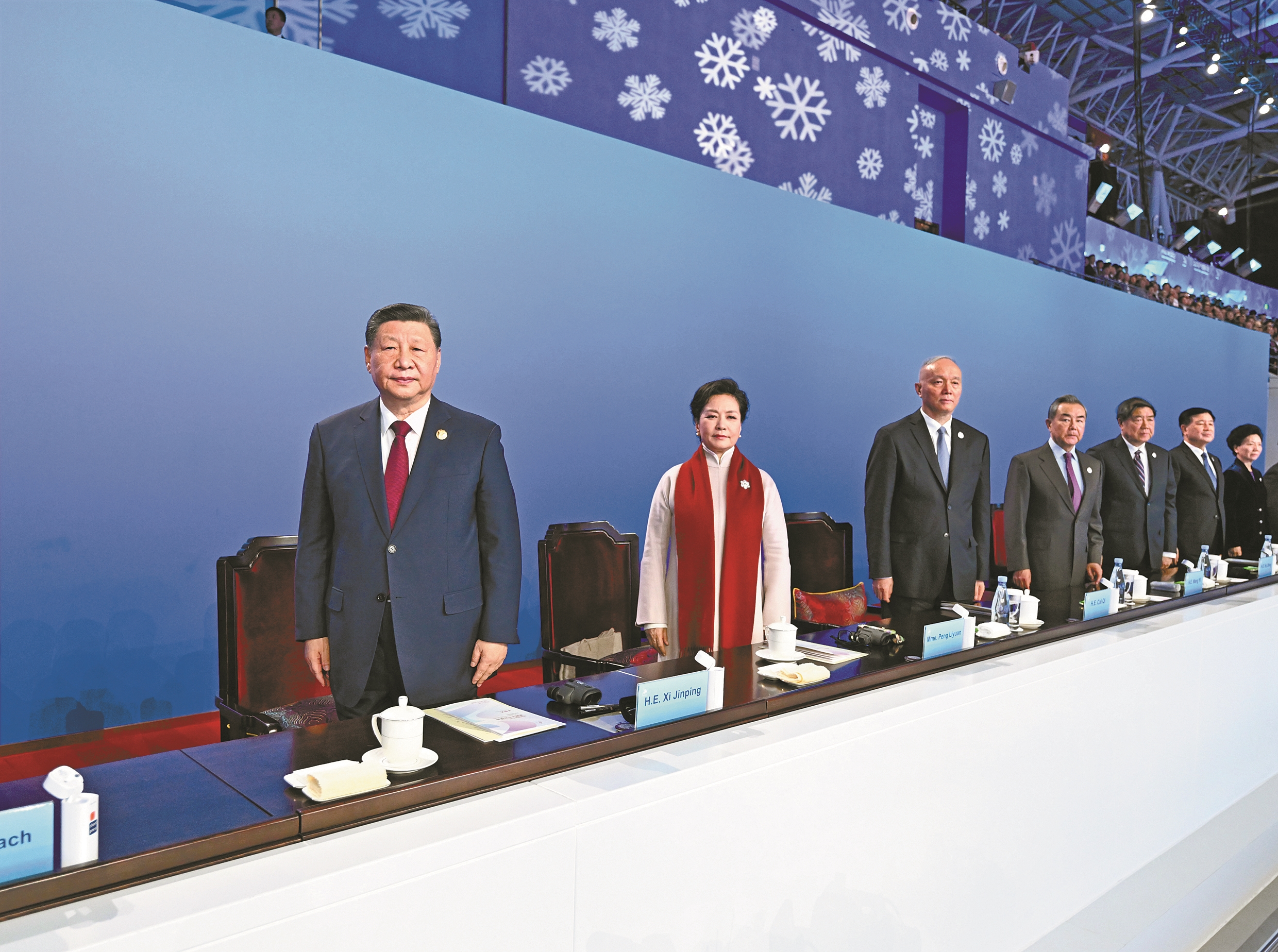 19时58分,在《和平——命运共同体》的乐曲声中,习近平和夫人彭丽媛,同国际奥委会主席巴赫、亚奥理事会第一副主席霍震霆等步入主席台,向观众挥手致意。全场响起长时间的热烈掌声。