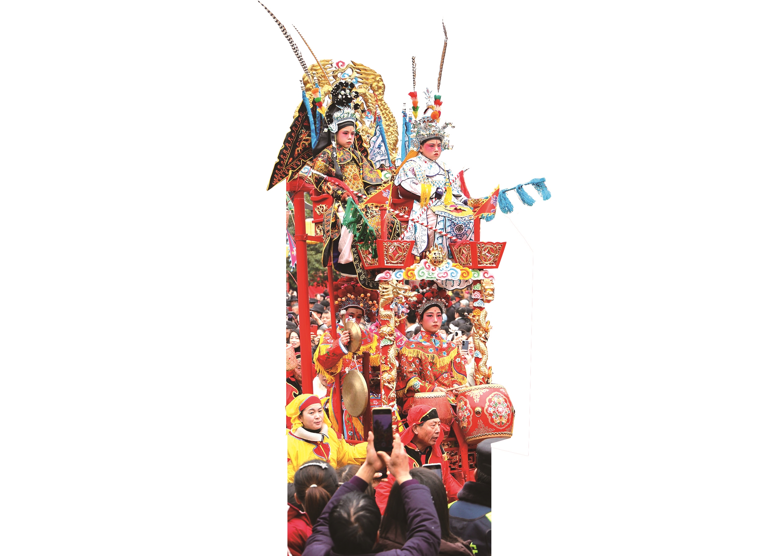 此外,在行会巡游中,最吸引人的莫过于用朱金漆木雕工艺制作的鼓亭、抬阁和秋千。