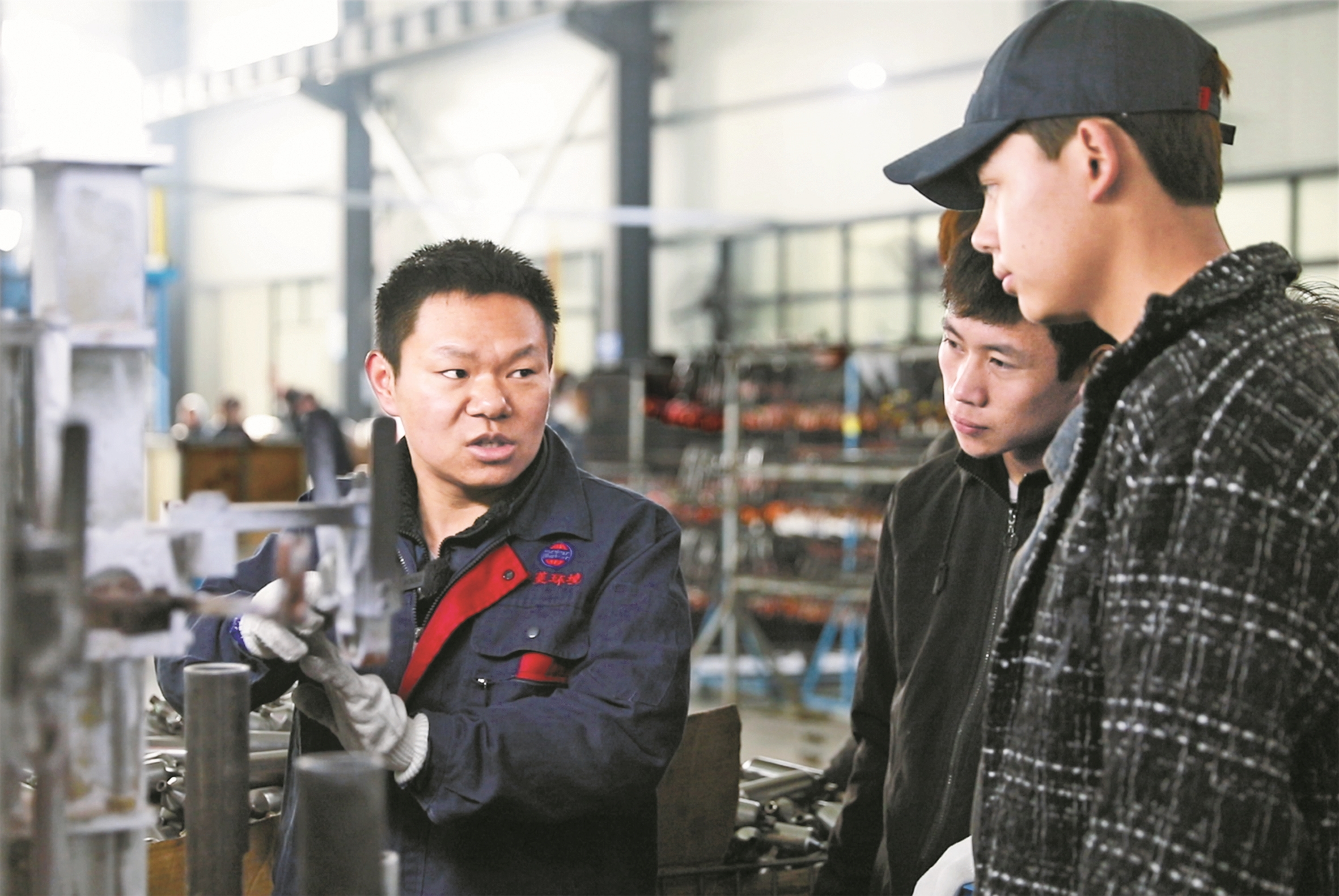 焊接组工段长张全(左)正在培训新员工。(陈章升 王林威 摄)