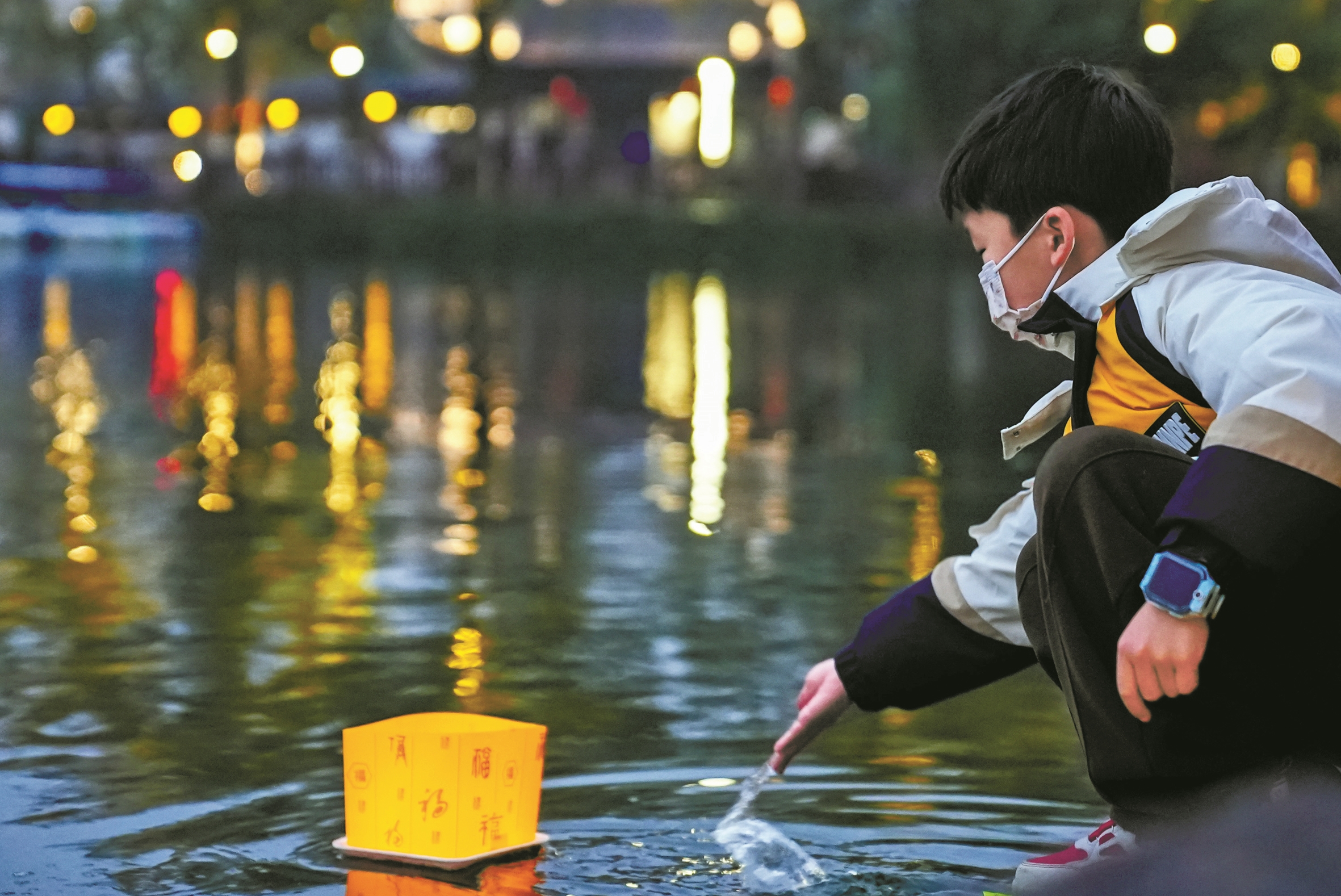 星落湖湾,千灯浮水。昨晚,不少市民游客欢聚月湖,将一盏盏寄托美好祝愿的河灯放入湖中。这也是自2005年以来,时隔20年,月湖再现这一古老民俗活动。