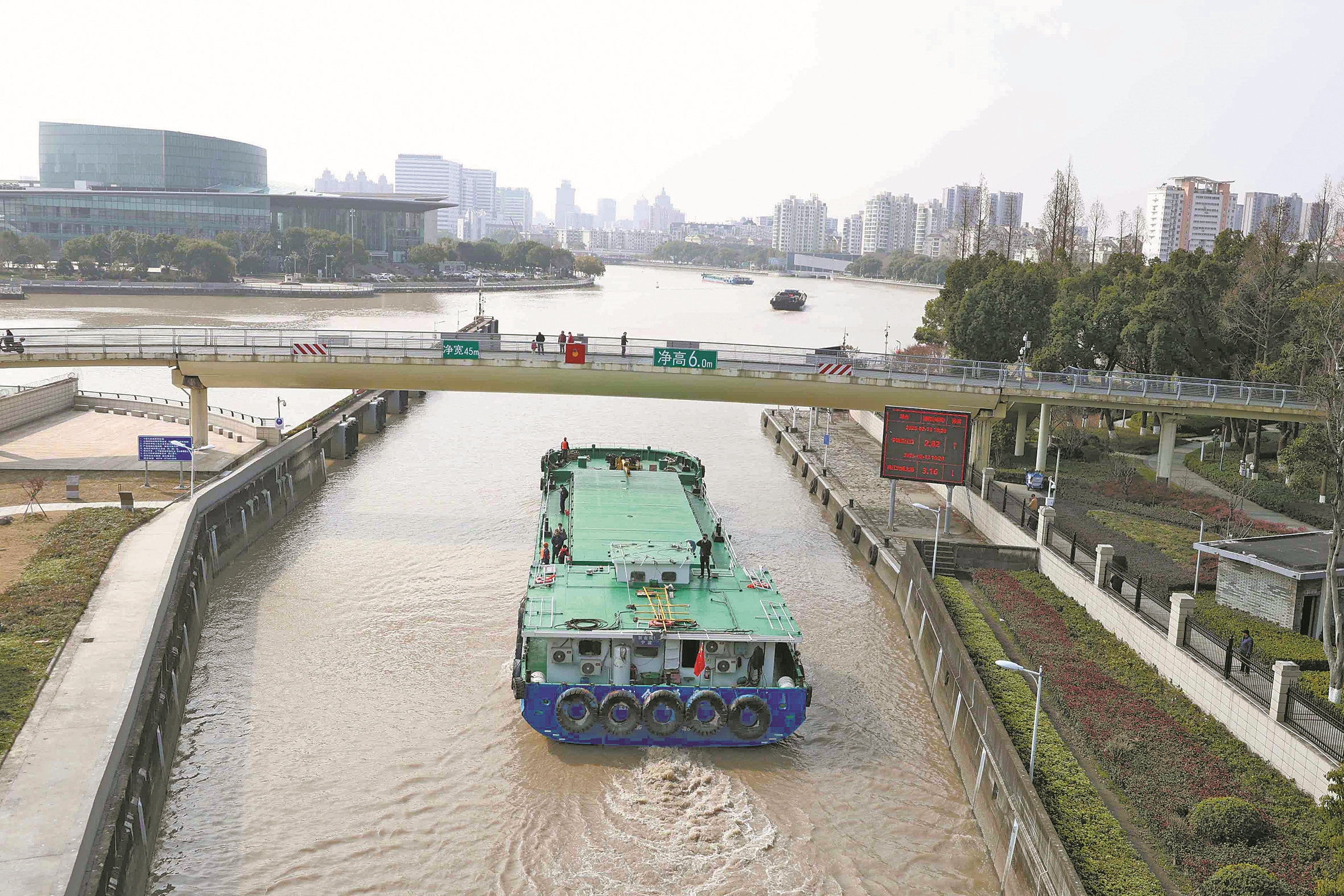 在连续16天的春节停航检修后,杭甬运河核心枢纽姚江船闸昨天恢复通航。