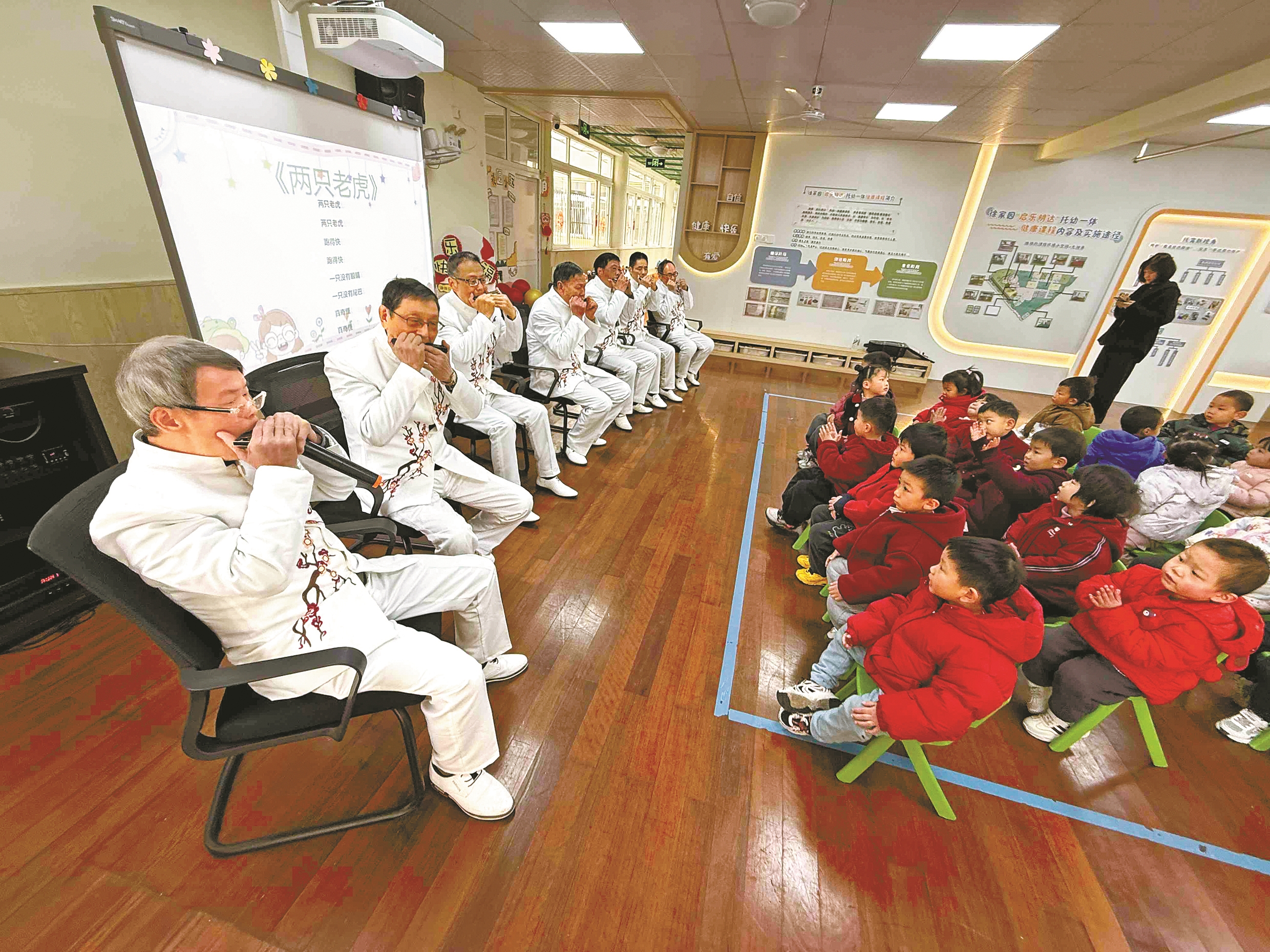 昨日,宁波市明楼幼儿园徐家园区,阵阵清亮的《小星星》旋律穿透走廊。徐戎口琴乐队的7名头发花白的老人,他们手中的口琴,正随着孩子们的拍手声吹出欢快的乐曲,现场气氛热烈,童声口琴声融成一片。(许天长 陈梦妤 华苑戎 摄)