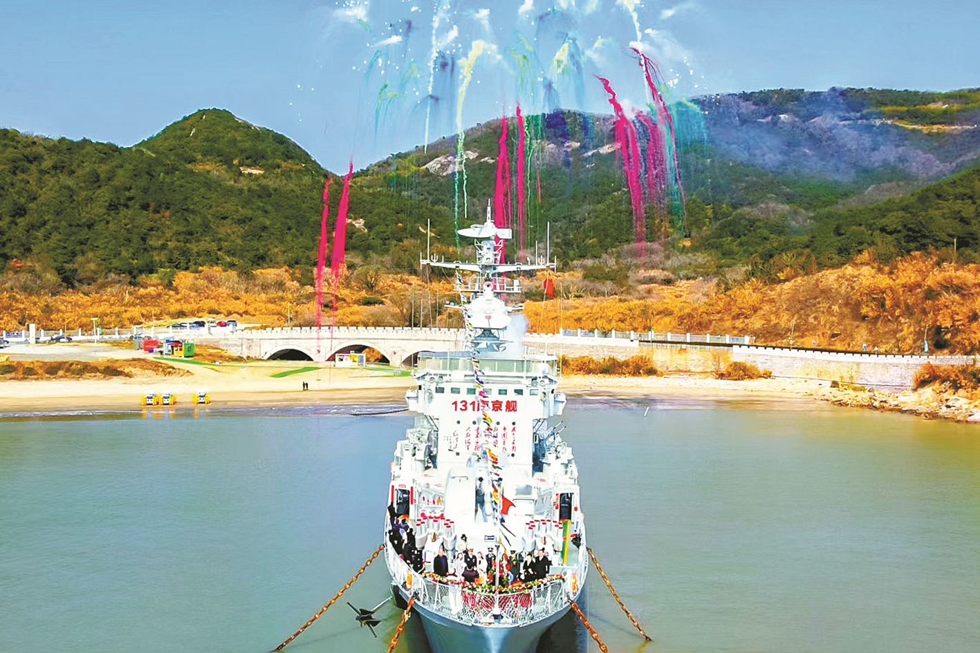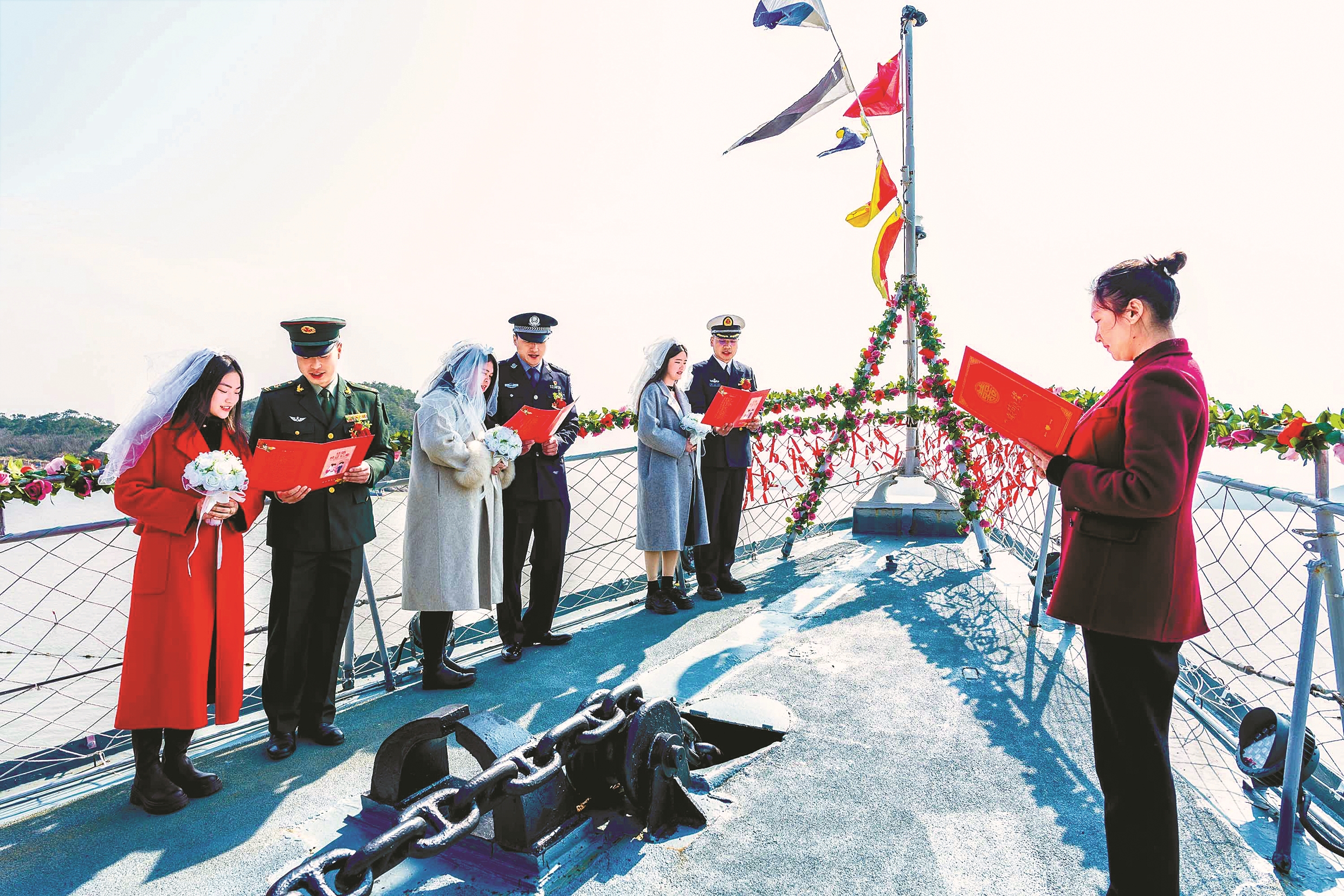 2月14日,东海半边山旅游度假区迎来了一场特别的浪漫盛事——在131南京舰上,首次为军婚、警婚新人隆重举办“踏浪而来,‘舰’证幸福——2025年东海半边山军舰集体婚礼”。来自象山县民政局的颁证员带领三对新人举行了庄严的结婚宣誓仪式。(徐能 吴敏勇 摄)