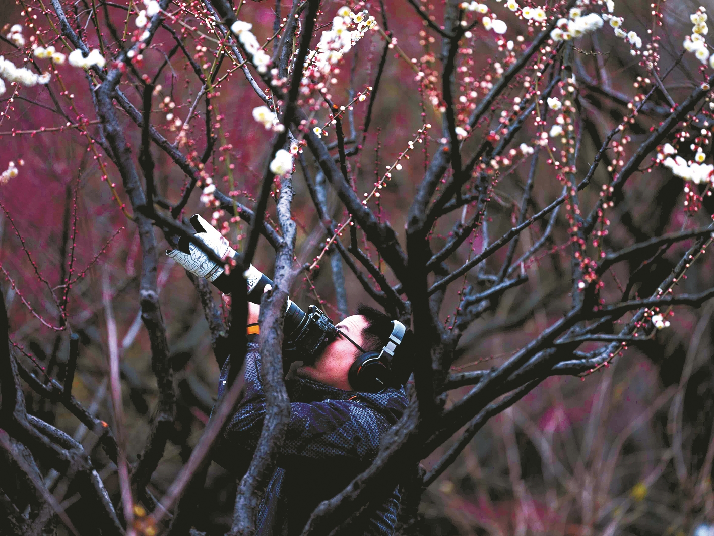 昨日,在宁波植物园,梅花在细雨中散发着别样的韵味。宁波植物园梅园占地约1.7公顷,拥有100余个梅花品种,构成了一片烂漫花海。据了解,宁波植物园中的梅花预计下周迎来最佳观赏期。 (徐诚 唐斌权 摄)
