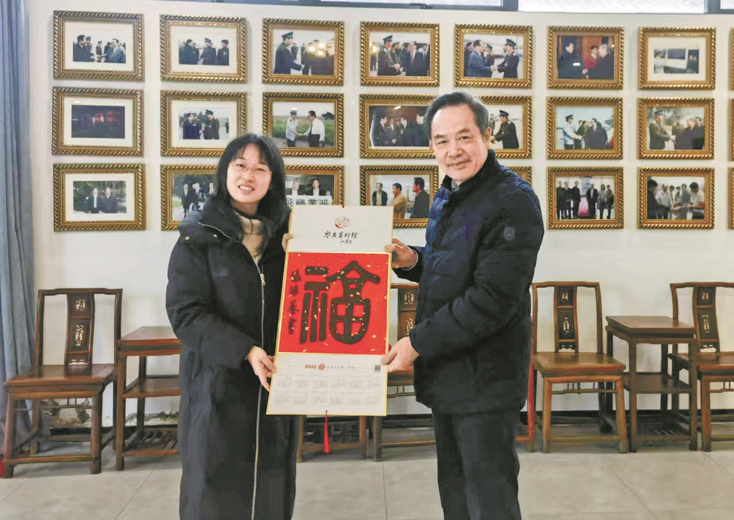 慈溪市周巷镇万安庄村村民张培基向宁波日报报网地方部记者水蓝薇(左一)赠送书法作品。 (受访者供图)