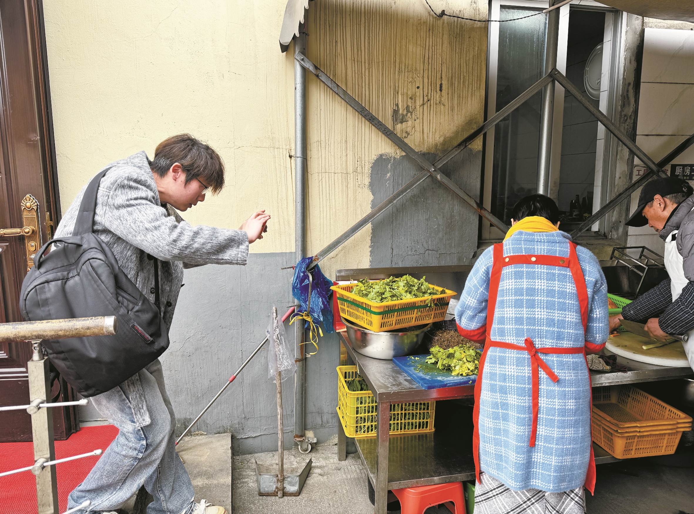 宁波日报报网地方部记者沈孙晖(左一)在镇海拍摄“村里的团圆饭”。 (虞笑梅 摄)