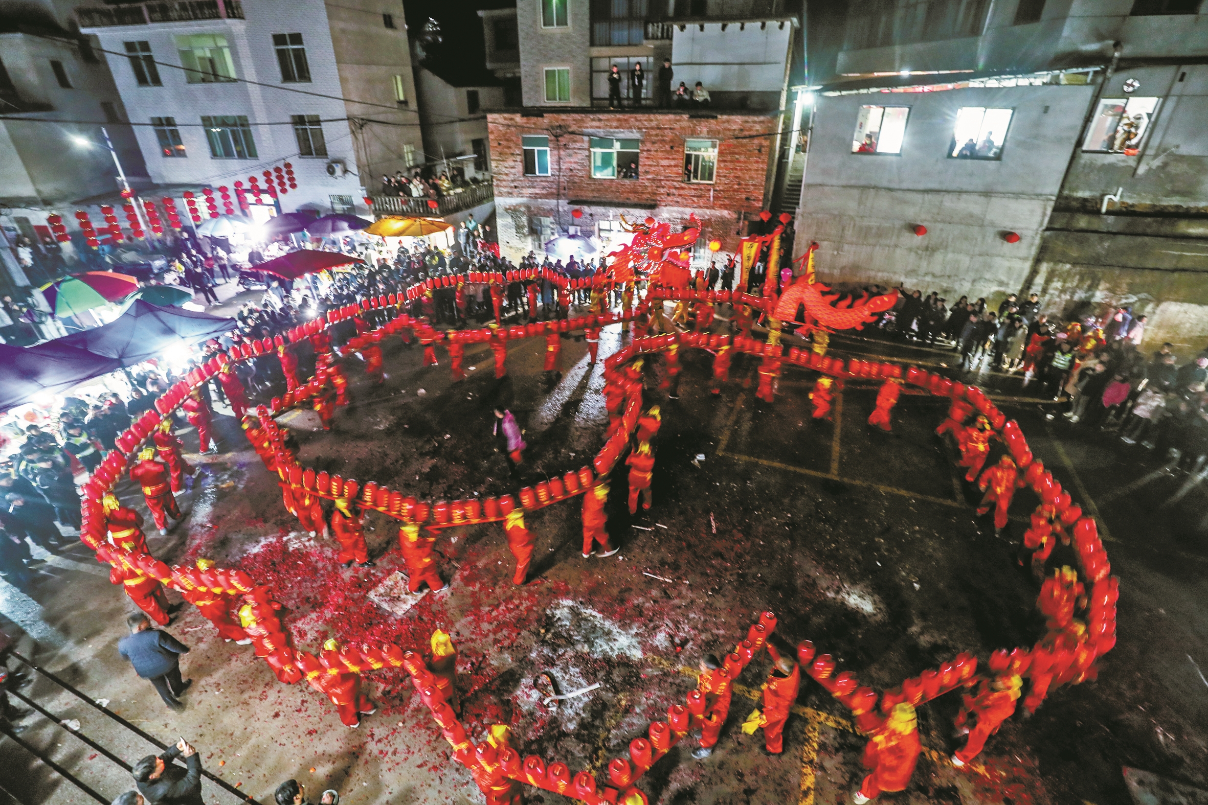 2月15日,大墅镇儒洪村村民们举行“赶十八”舞龙表演。