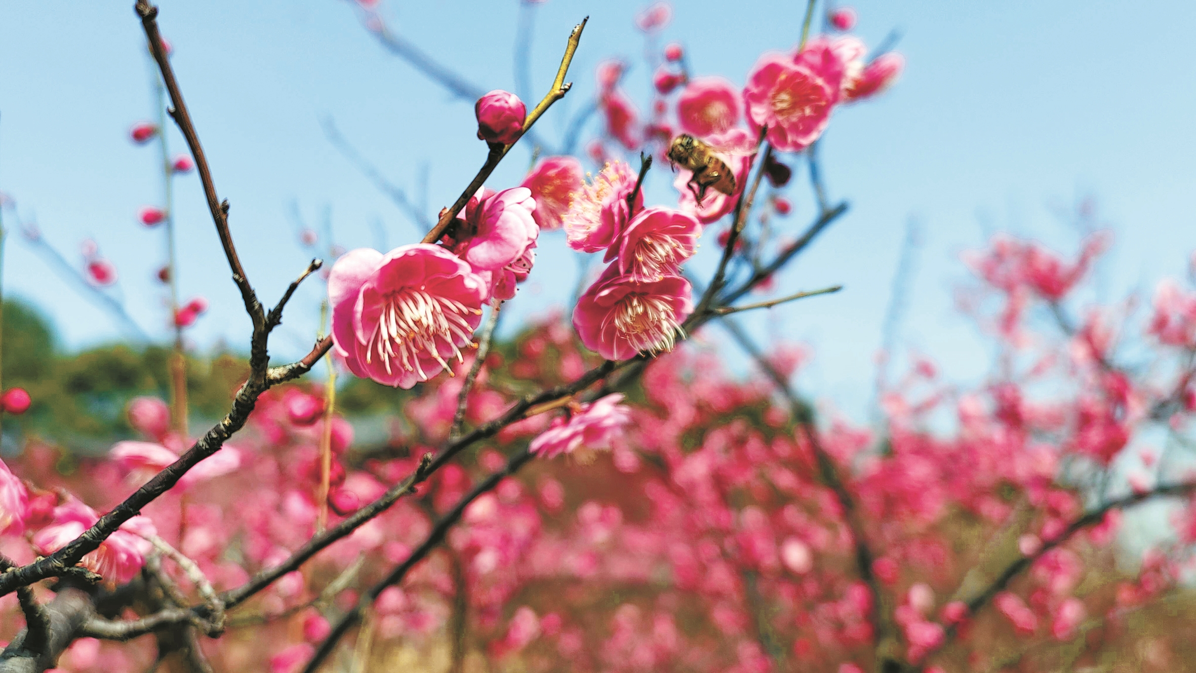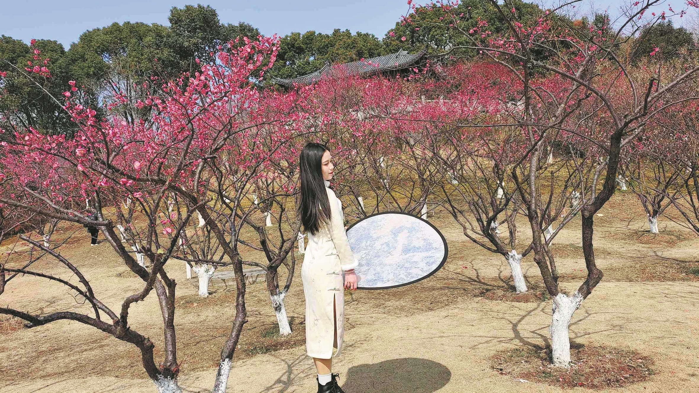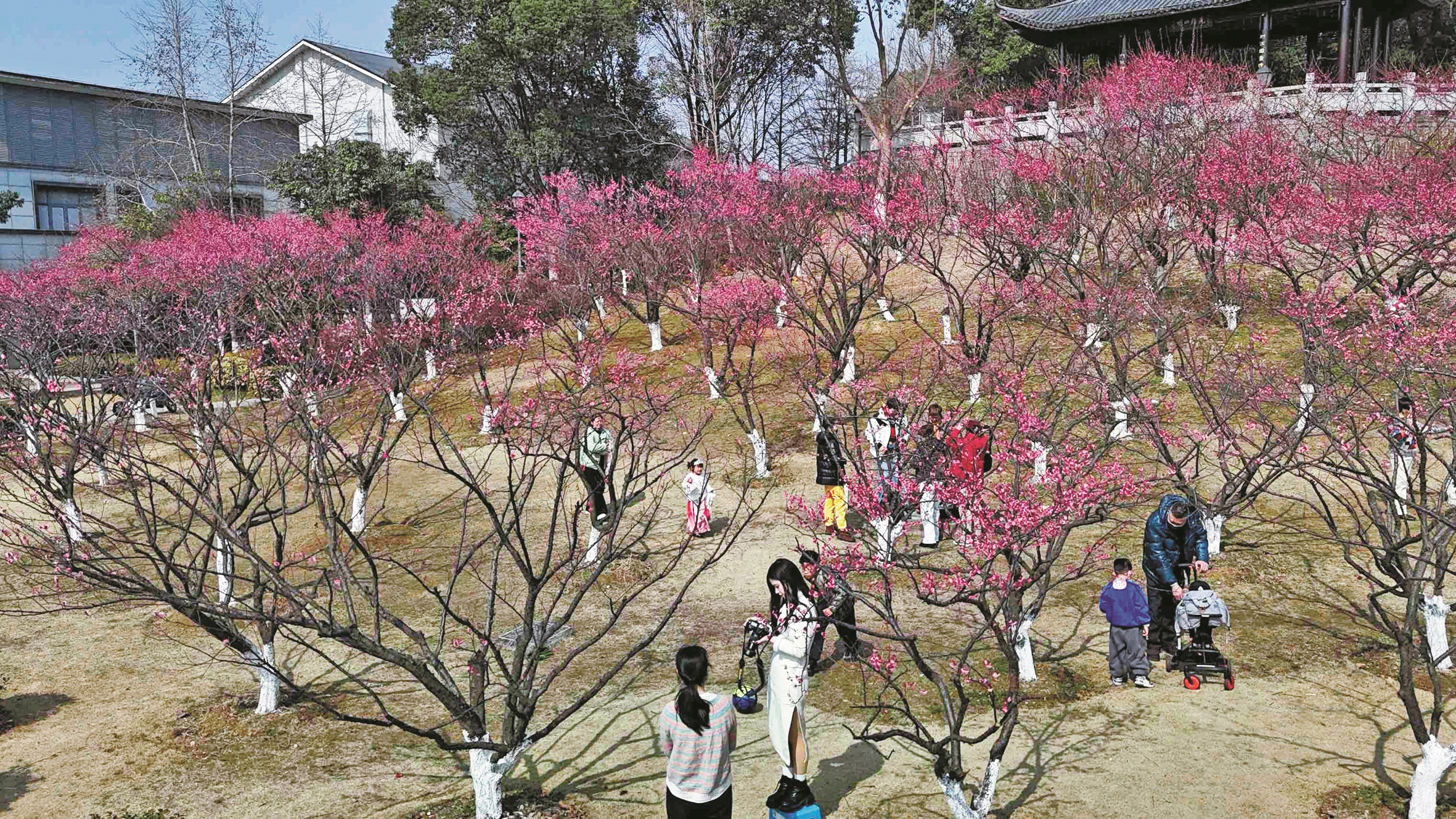 前日,在余姚玉皇山公园,成片的红梅艳丽绽放、香气袭人,吸引了众多市民和游客前来观赏、拍照。