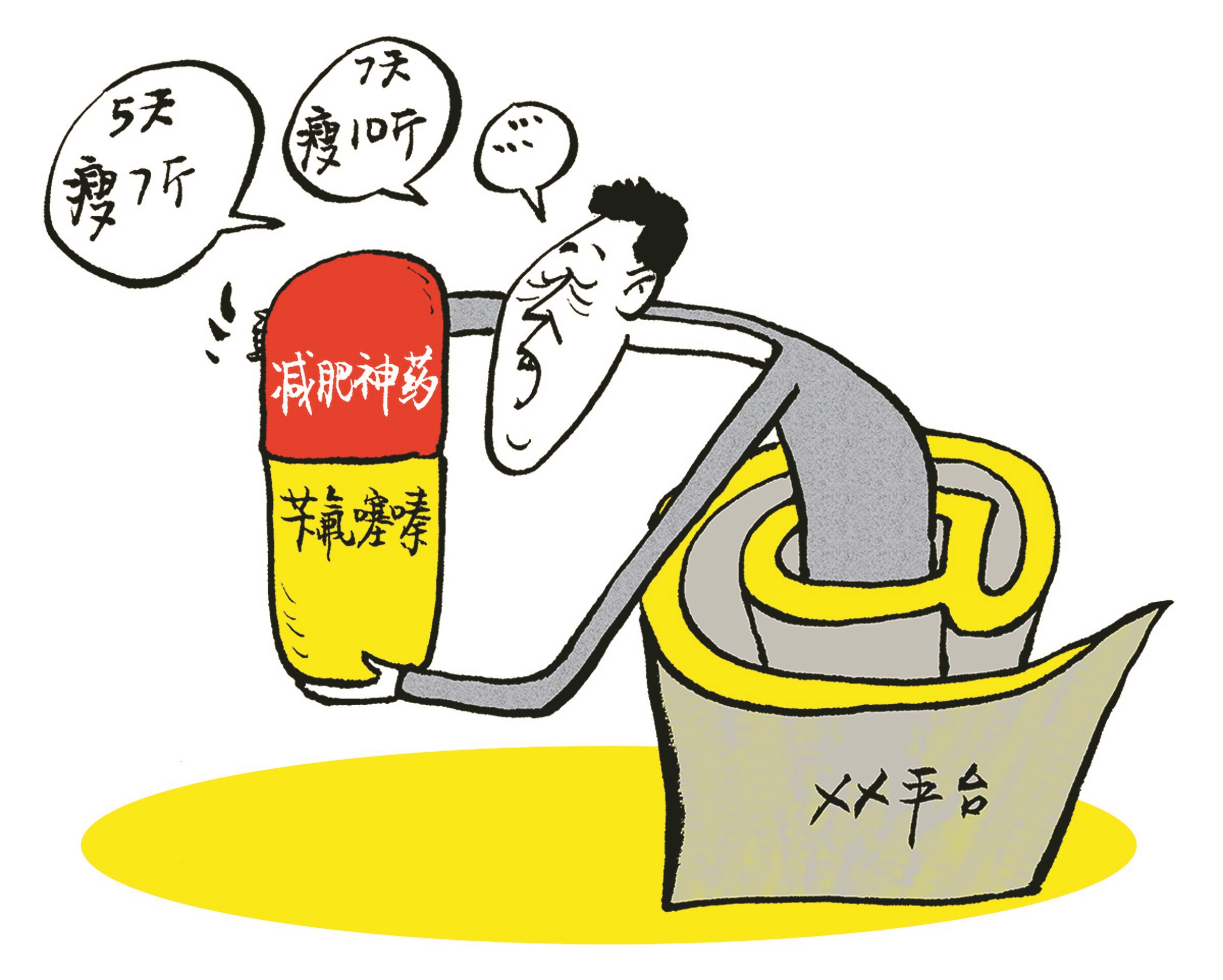 5天瘦7斤、7天瘦10斤……在某短视频平台直播间,有500多万粉丝的女网红带货“减肥神药”,不少消费者心动下单,服用后却出现腹泻、呕吐等症状。原来,该“减肥神药”中非法添加了处方药“苄氟噻嗪”。从委托生产到直播带货、饥饿营销,一条非法添加黑色链条环环相扣(2月18日《经济参考报》)。
