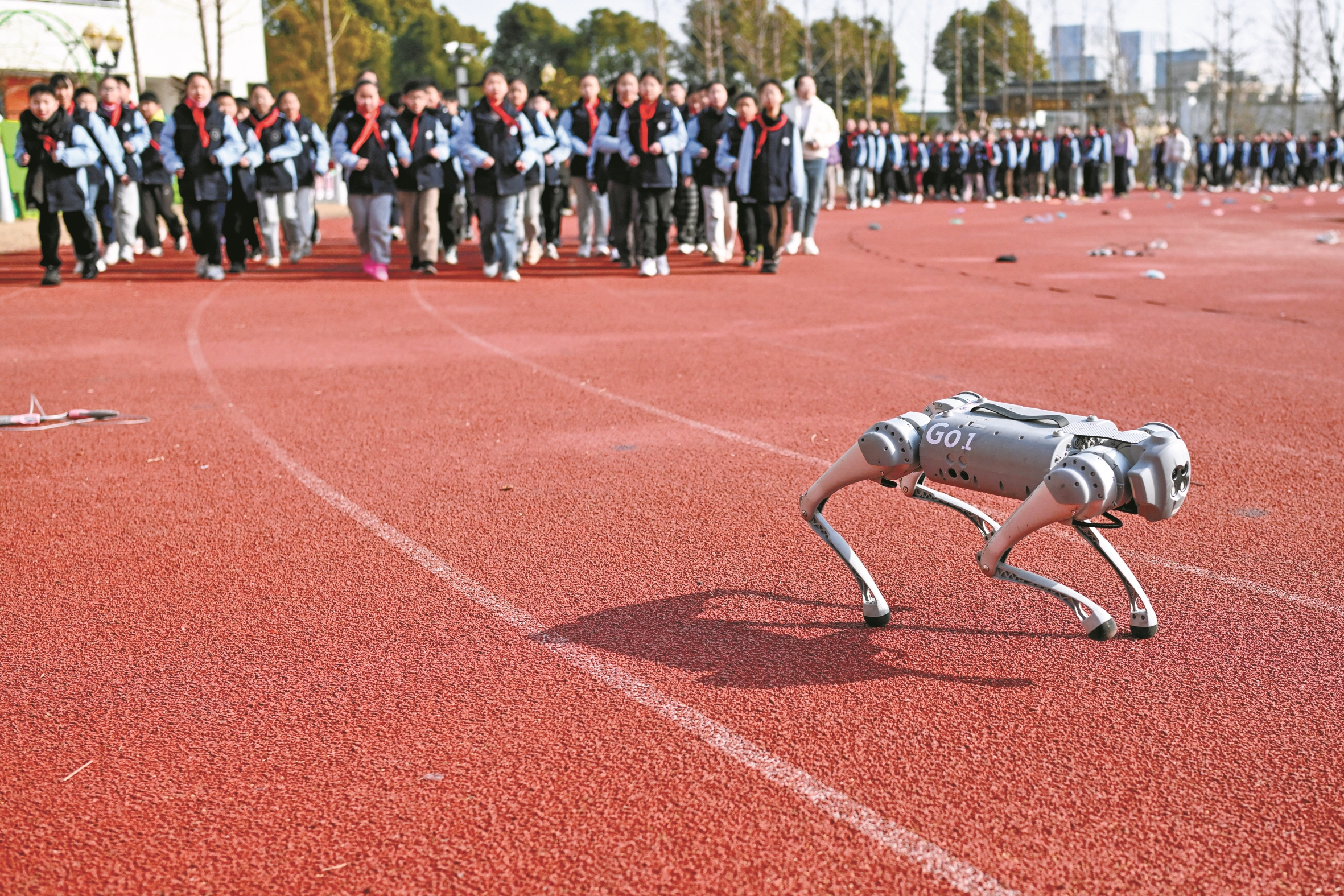2月19日,在江苏省昆山市信义小学,机器狗带领学生在大课间活动跑步。