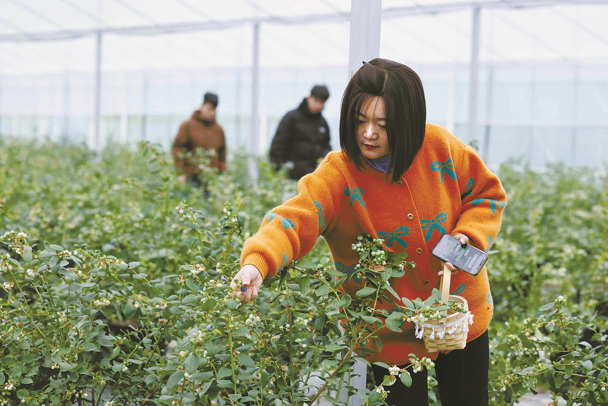 天宫庄园蓝莓种植基地迎来采摘季。昨日上午,记者在天宫庄园蓝莓种植基地,看到个头饱满的蓝莓簇拥在枝头,几名游客在果农的指导下正在采摘成熟的蓝莓。