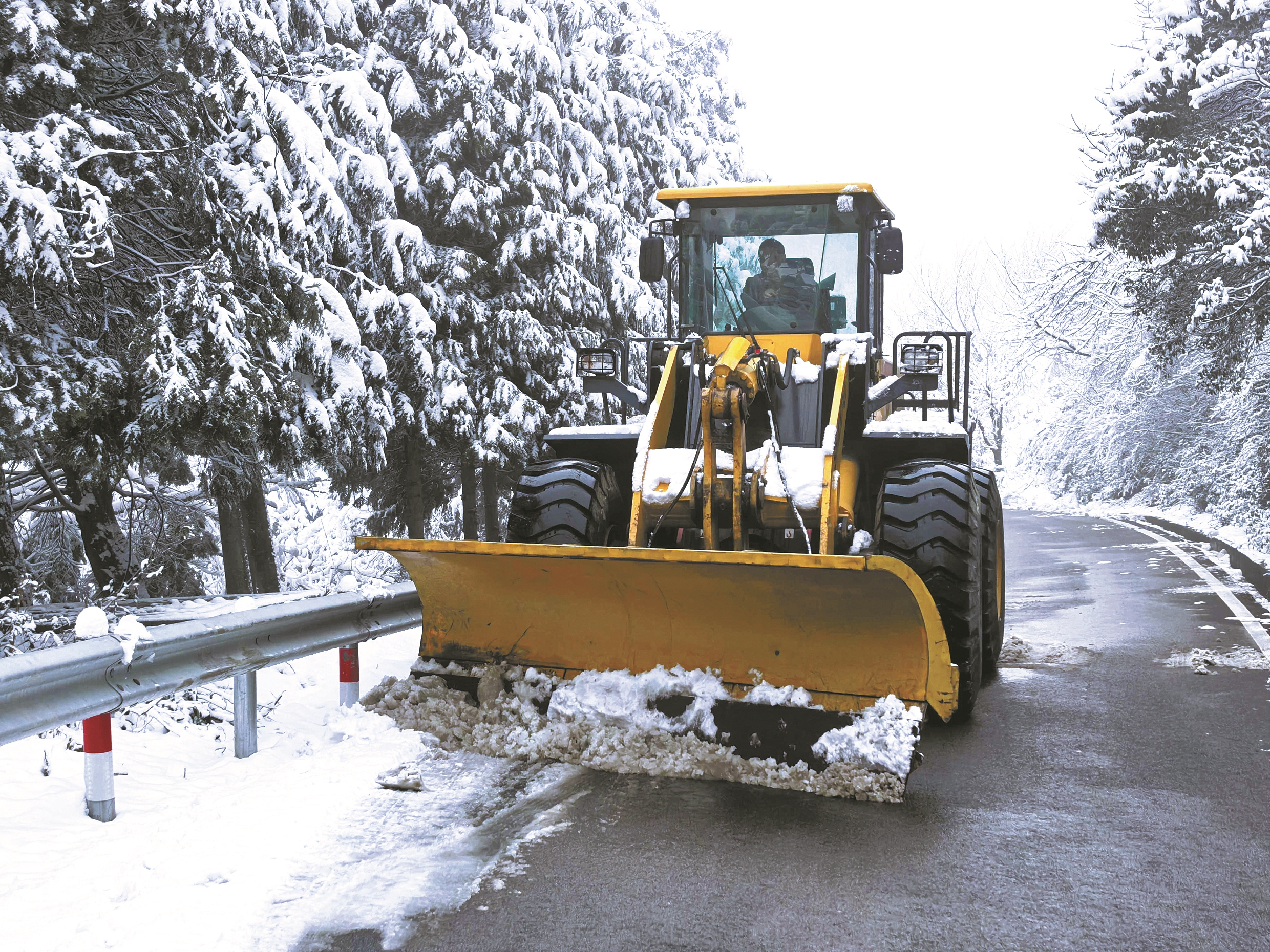 铲雪、扫雪、融雪……昨日上午,在奉桐线四明山镇屏风山村段,10余名来自余姚市舜畅公路养护有限公司的抢险队员驾驶除雪车辆通力配合,高效清理主干道积雪。针对陡坡、急弯等危险路段,养护工人还撒布了融雪剂,确保行车安全。 (顾佳诚 陆燕娜 摄)