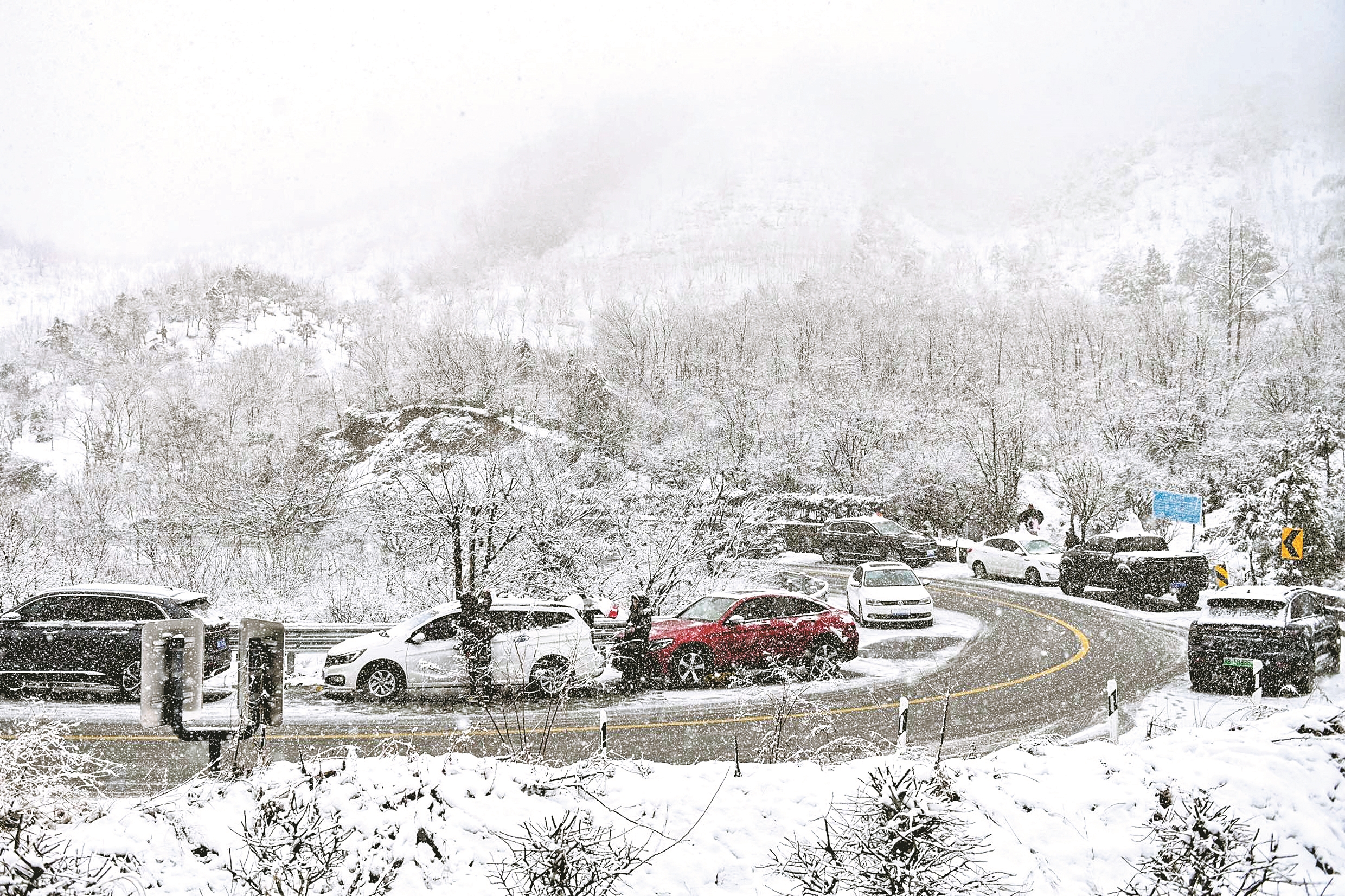 昨天,四明山高海拔区域鹅毛大雪漫天飞舞,道路车辆行驶滞缓。(沈天舟 摄)