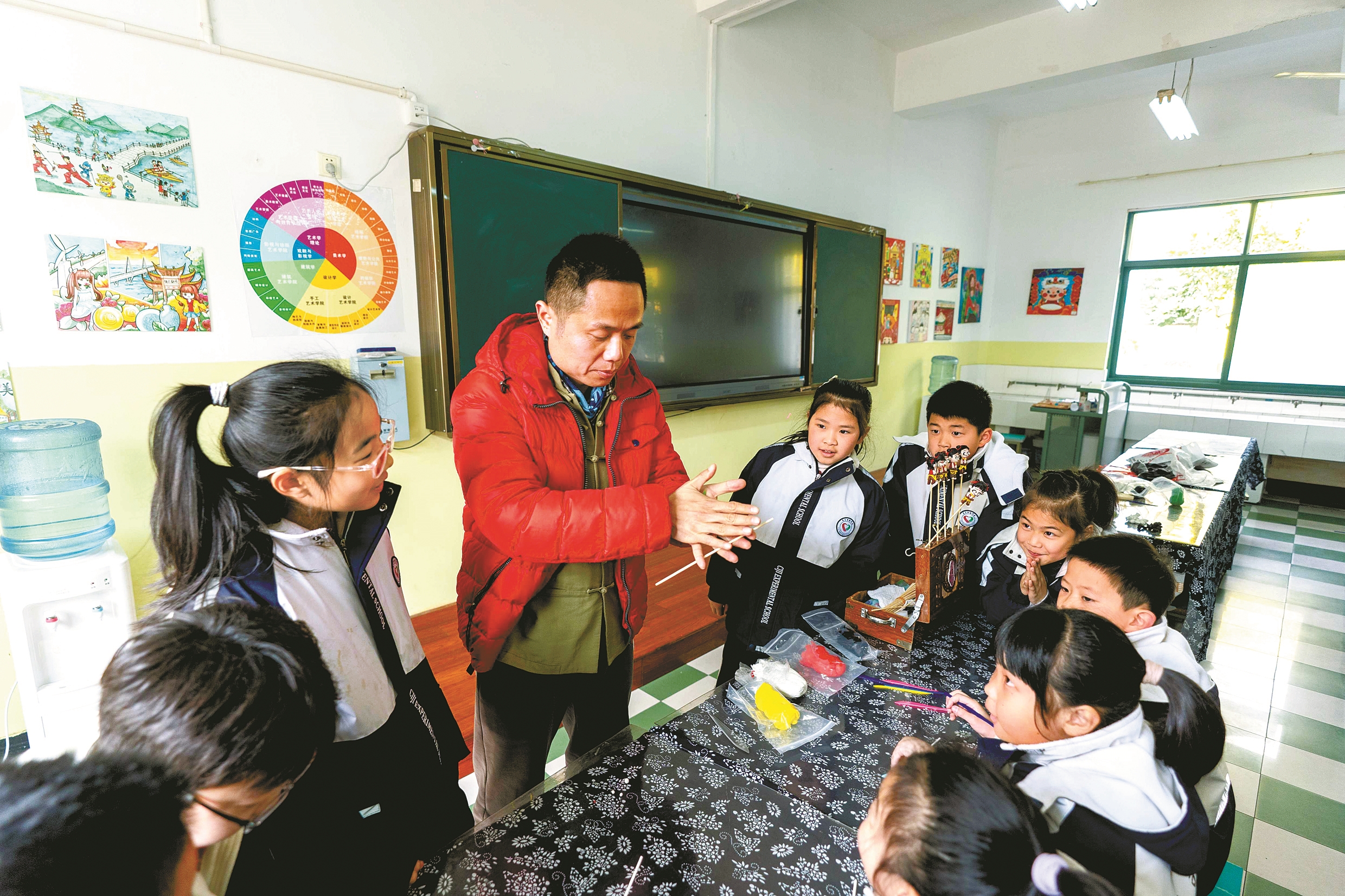 日前,慈溪市面塑非遗代表性传承人孙文聪走进慈吉实验学校,利用课间15分钟,为同学们带来了一场别开生面的面塑技艺体验活动。今年以来,宁波多所学校开始推行课间15分钟活动。慈吉实验学校创新推出了脊柱操、踢毽子等深受学生喜爱的体育文化体验活动,让课间时光既充实又有趣。(唐严 摄)