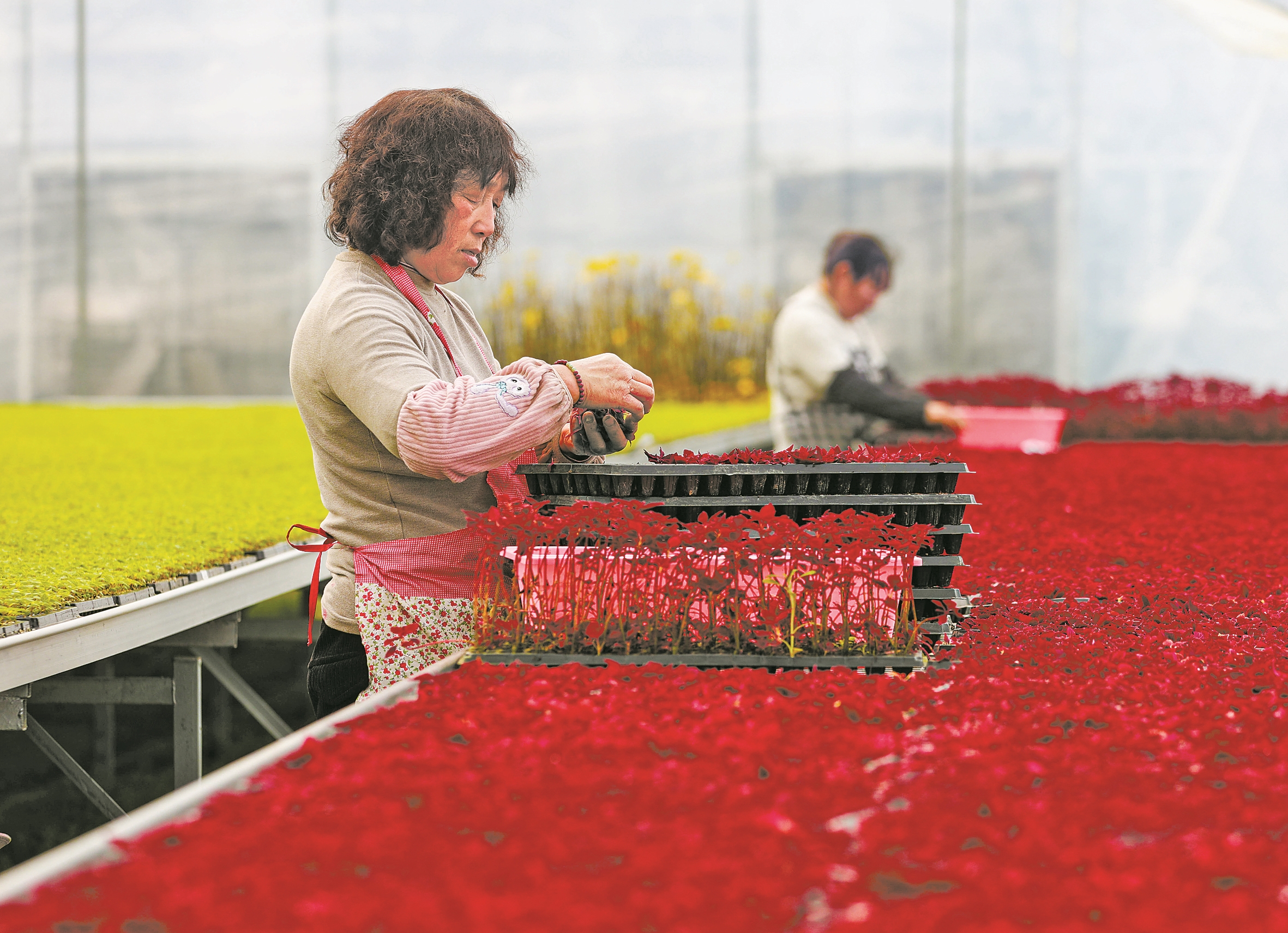 昨天,镇海区九龙湖镇种苗培育基地的大棚内绿意葱茏,处处洋溢着生机勃勃的气息。农户争分夺秒,抢抓农时开展育苗工作。