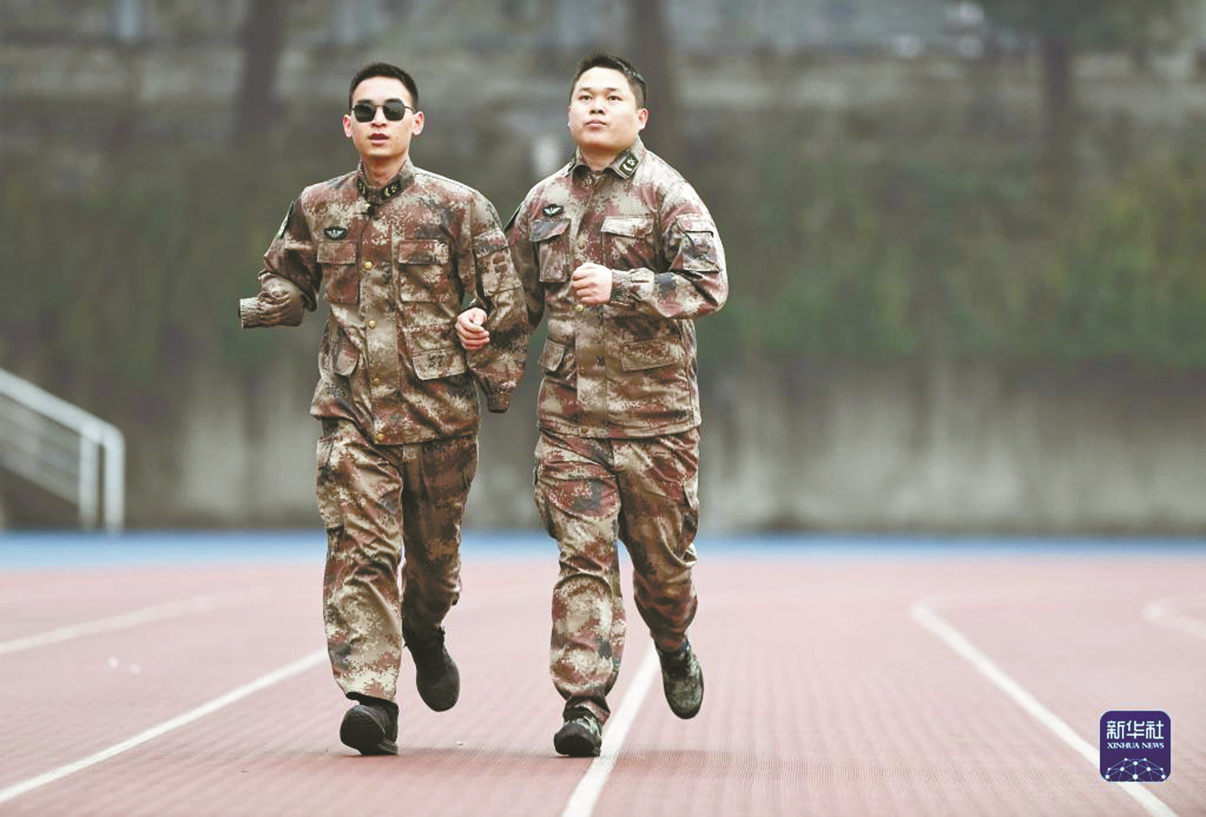 图:2020年1月2日,“排雷英雄战士”杜富国(左)和战友在陆军军医大学操场上跑步(资料照片)。