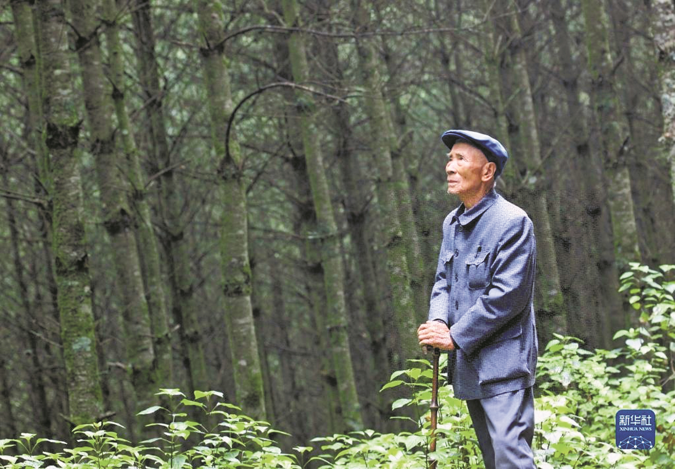 图:退休后回到家乡云南施甸植树造林的杨善洲望着树林(资料照片)。