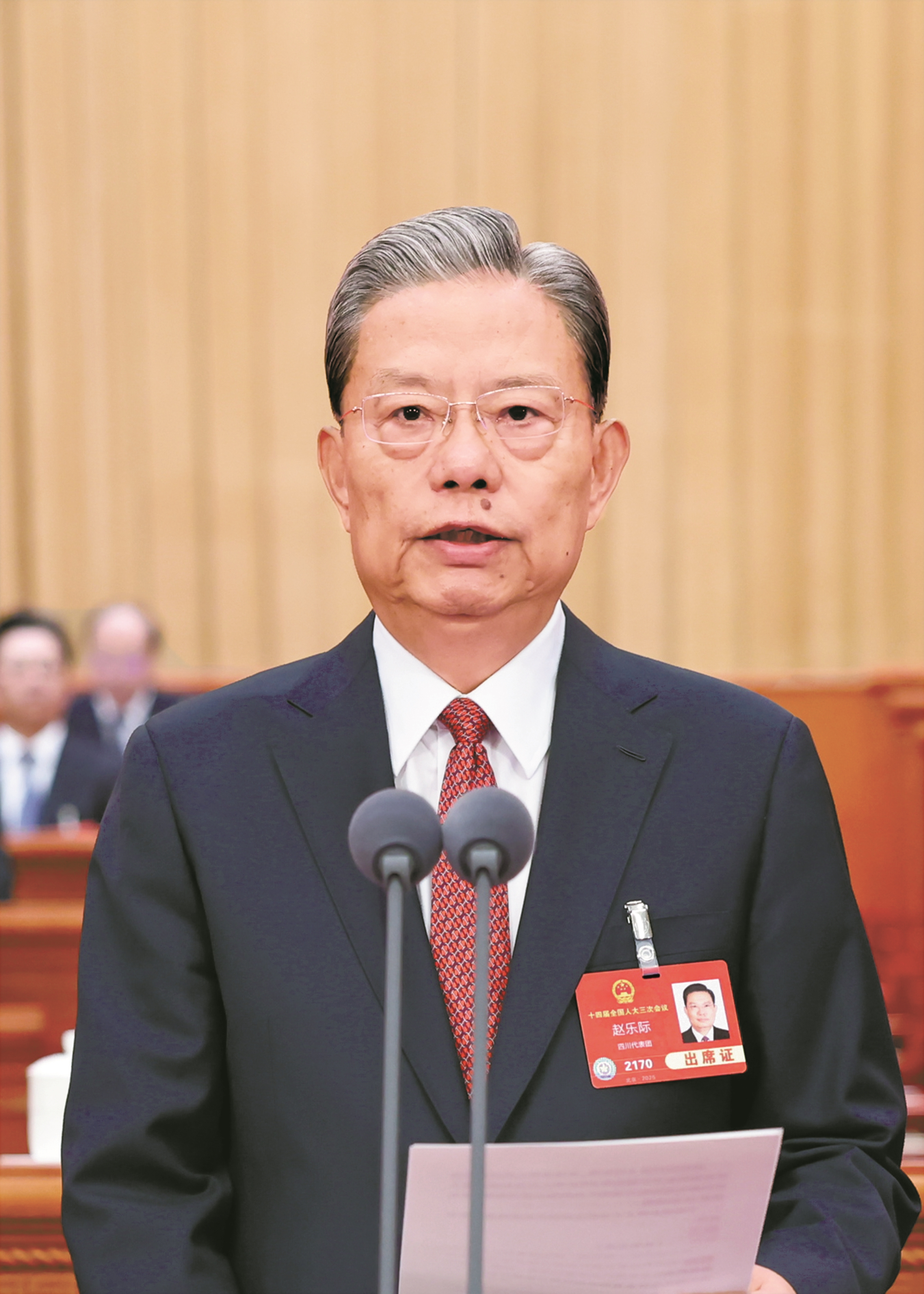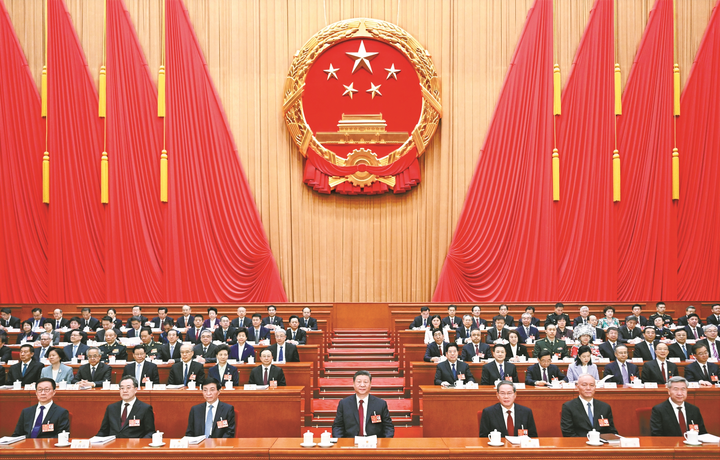 人民大会堂大礼堂气氛庄重热烈,主席台帷幕正中的国徽与会场穹顶上的五角星灯交相辉映。