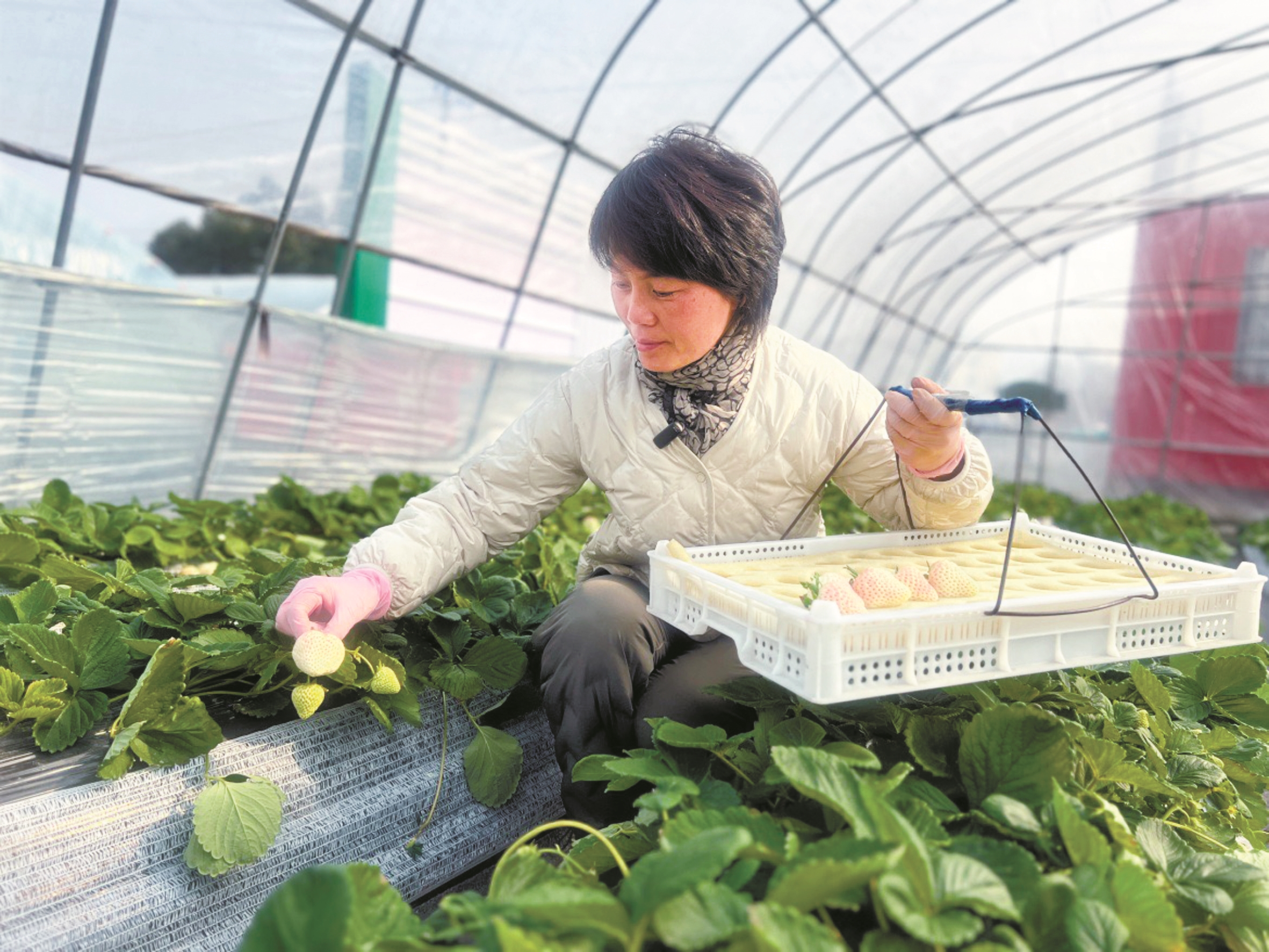 图为奉化钱多多草莓农场工作人员在采摘草莓。(戎美容 摄)