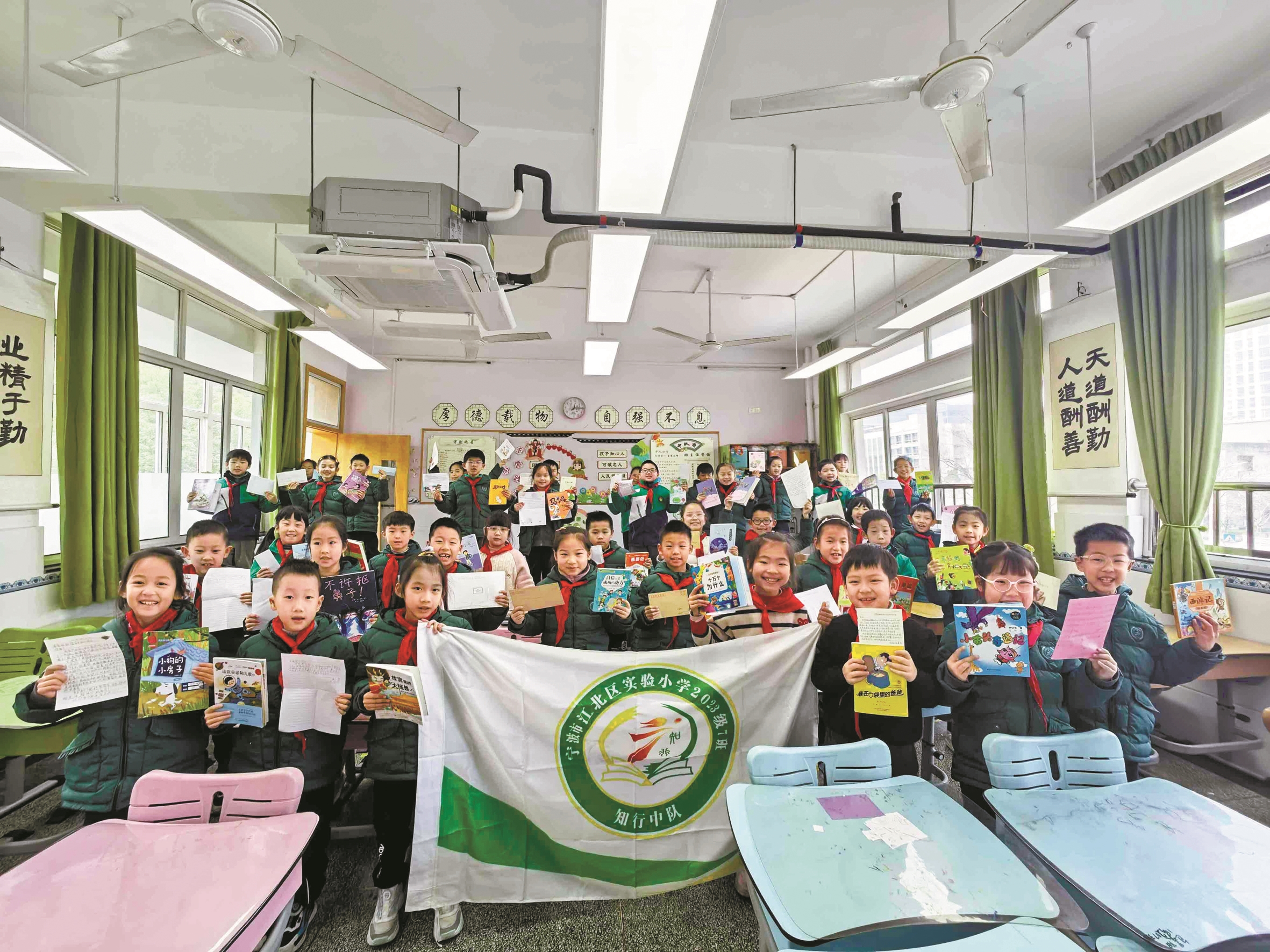 宁波市江北区实验小学的学生正在展示送往库车的图书和信件。