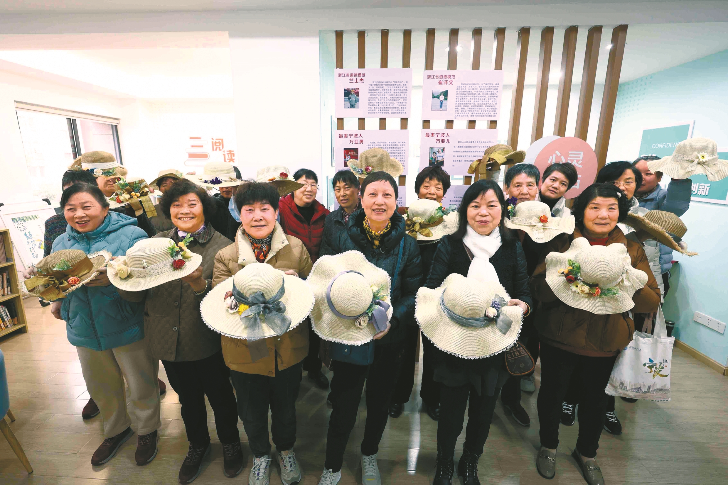 前日,鄞州区福明街道和城社区党群服务中心联合社区妇联开展创意手工活动,志愿者带领辖区网格员、流动党员、垃圾分类桶边督导员等女性,共同参与制作精美草帽。